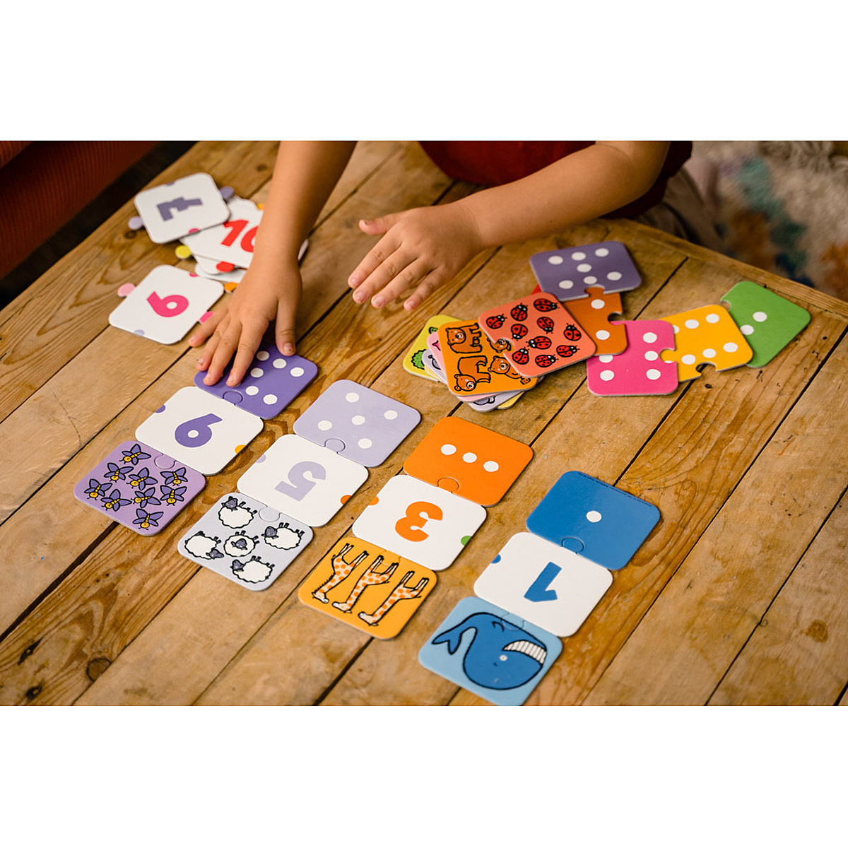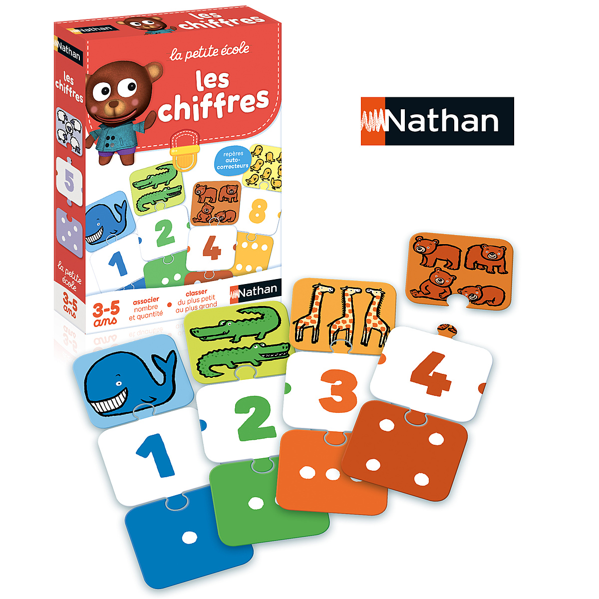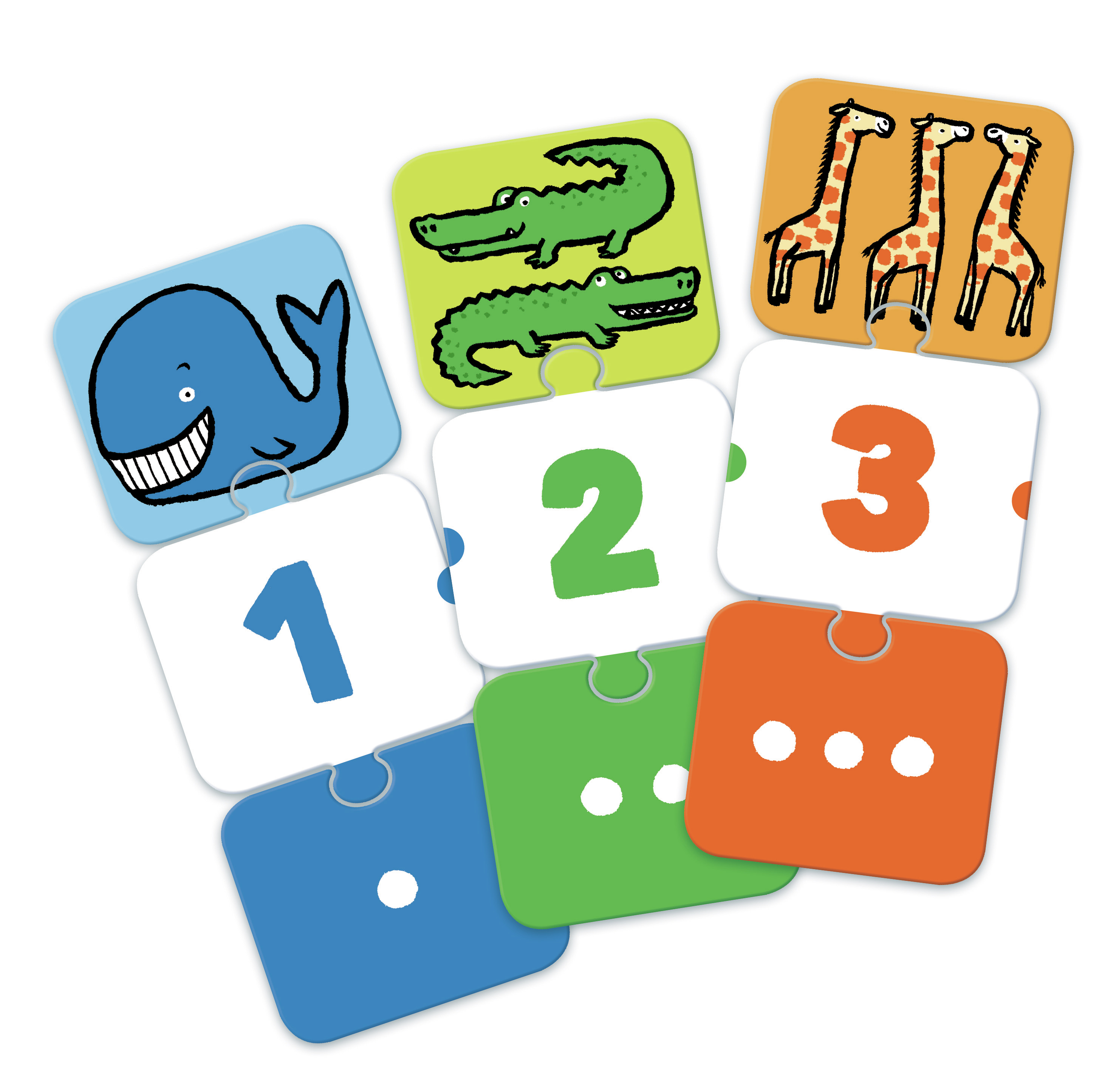 6 jeux progressifs pour apprendre à reconnaitre les chiffres et à compter, en jouant seul ou à plusieurs. Des images affectives de toutes les couleurs de l'arc-en-ciel. Les nombres de 1 à 10 sont représentés par des animaux de plus en plus petits. L'enfant associe l'image au nombre et à la quantité, puis reconstitue la farandole des animaux du plus gros au plus petit.