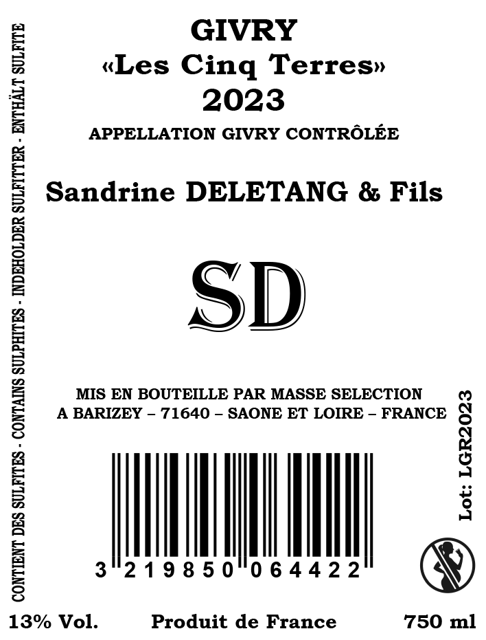 | Libellé | Les Cinq Terres, Sandrine Deletang & Fils, 2023 - Givry AOP - Rouge - 75 cl |