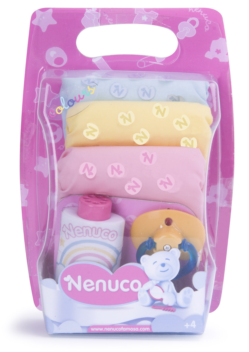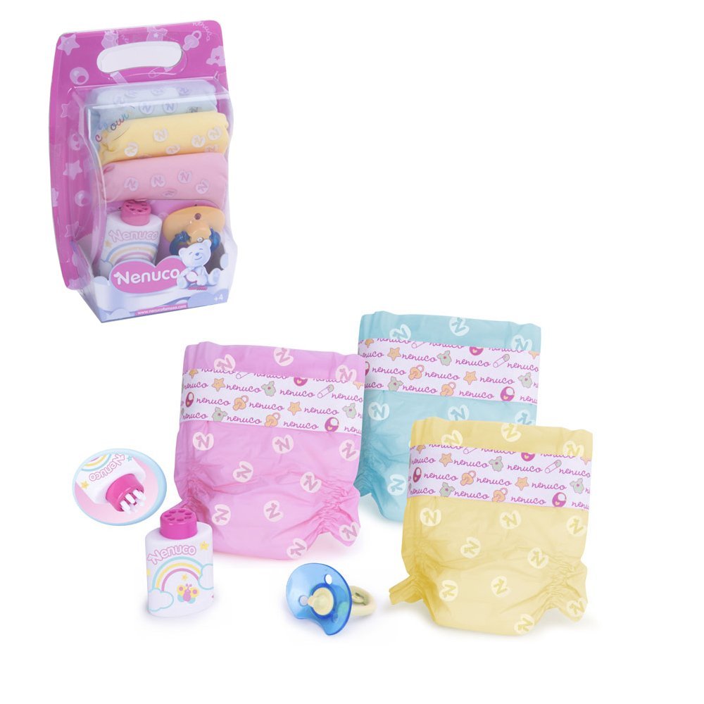 Coffret de 3 couches Nenuco colorées (rose, jaune et bleue) avec des autocollants de maintien comme de vraies couches.