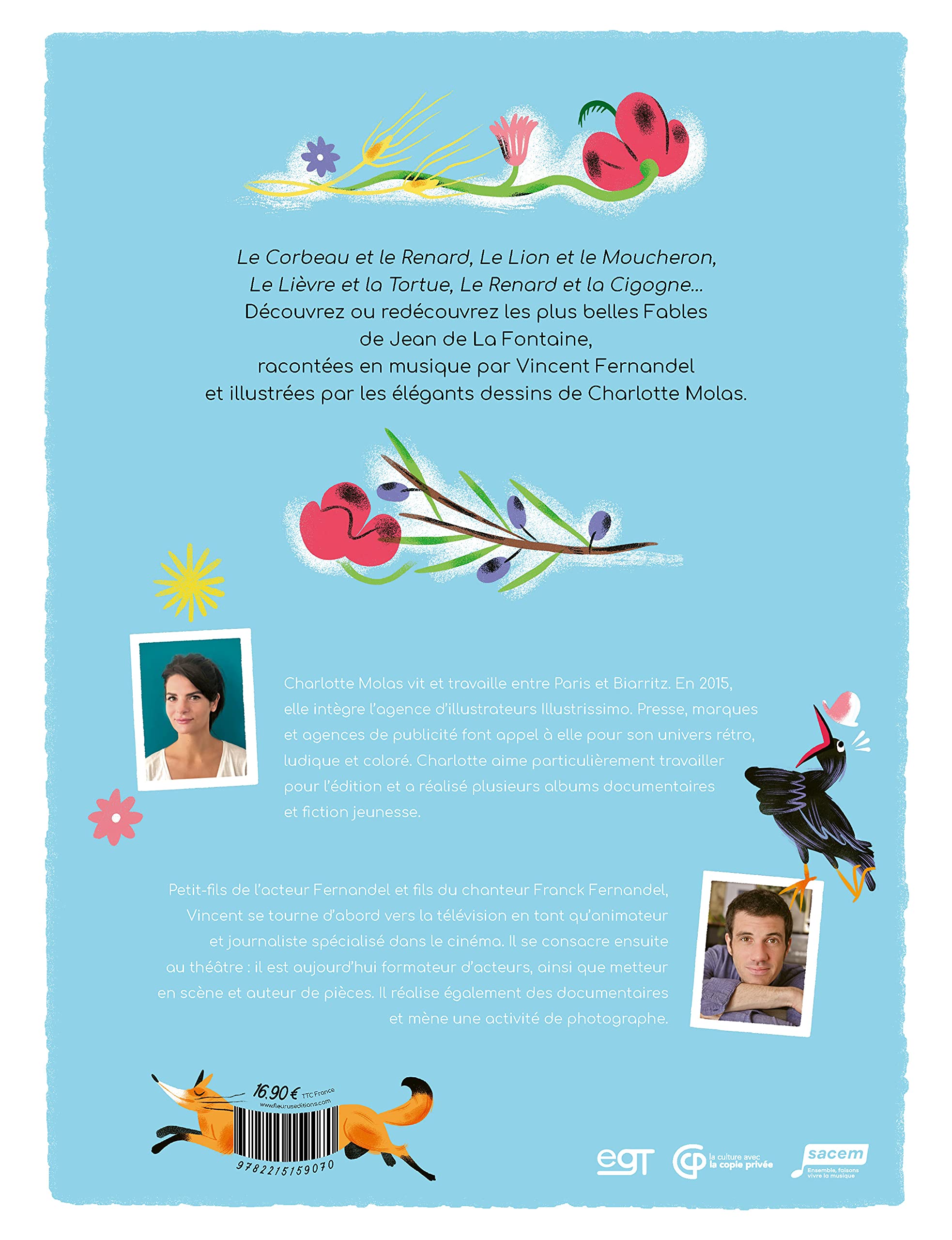 Le Corbeau et le Renard, Le Rat des villes et le Rat des champs, Le Lion et le Moucheron, Le Lièvre et la Tortue… Les 17 plus belles fables de Jean de La Fontaine compilées dans un magnifique album et racontées en musique par Vincent Fernandel.