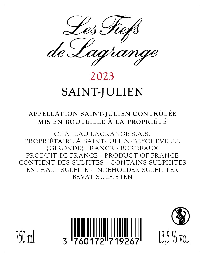 | Libellé | Les Fiefs de Lagrange, 2023 - Saint-Julien AOP - Rouge - 75 cl |