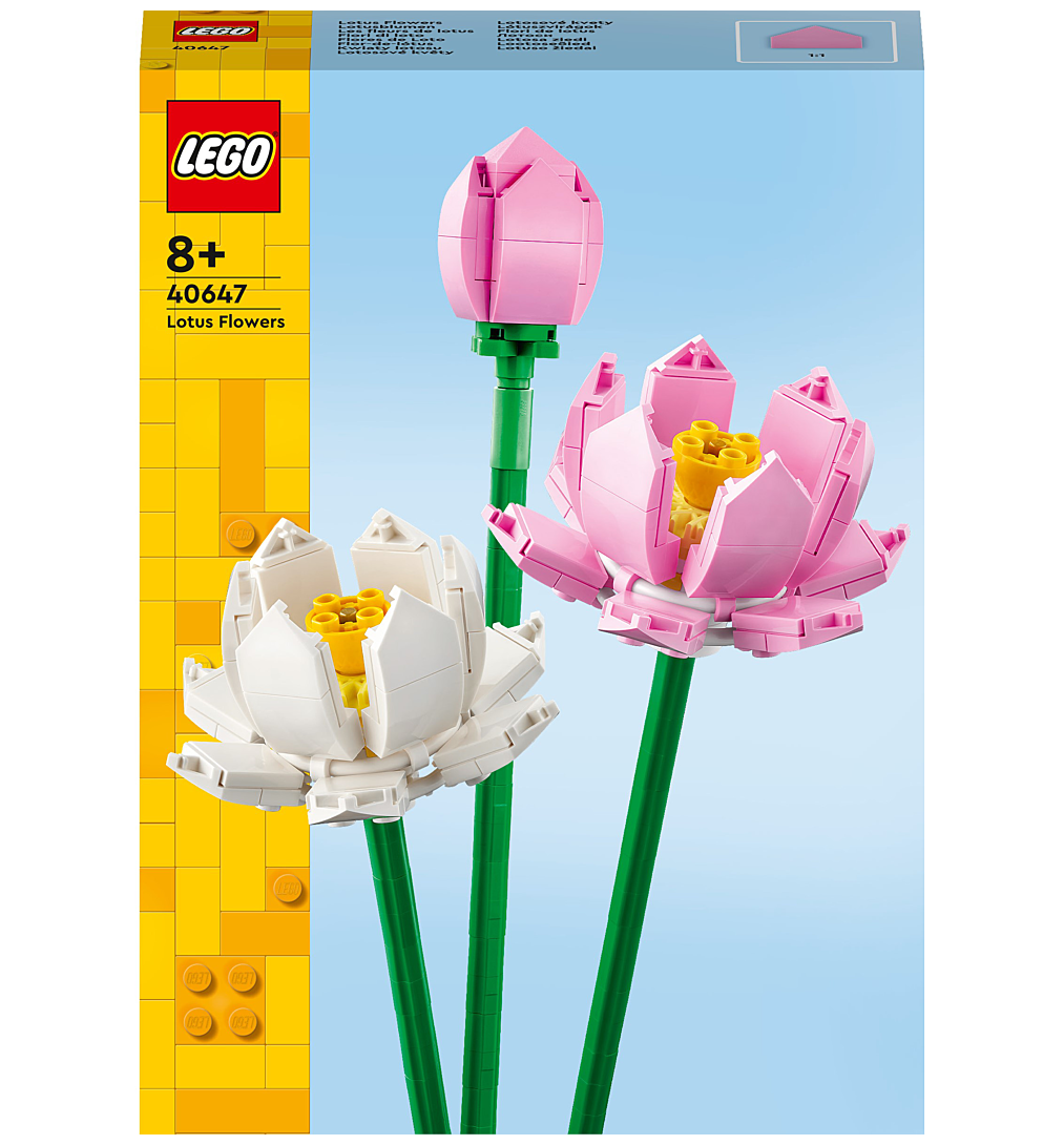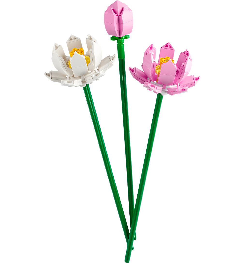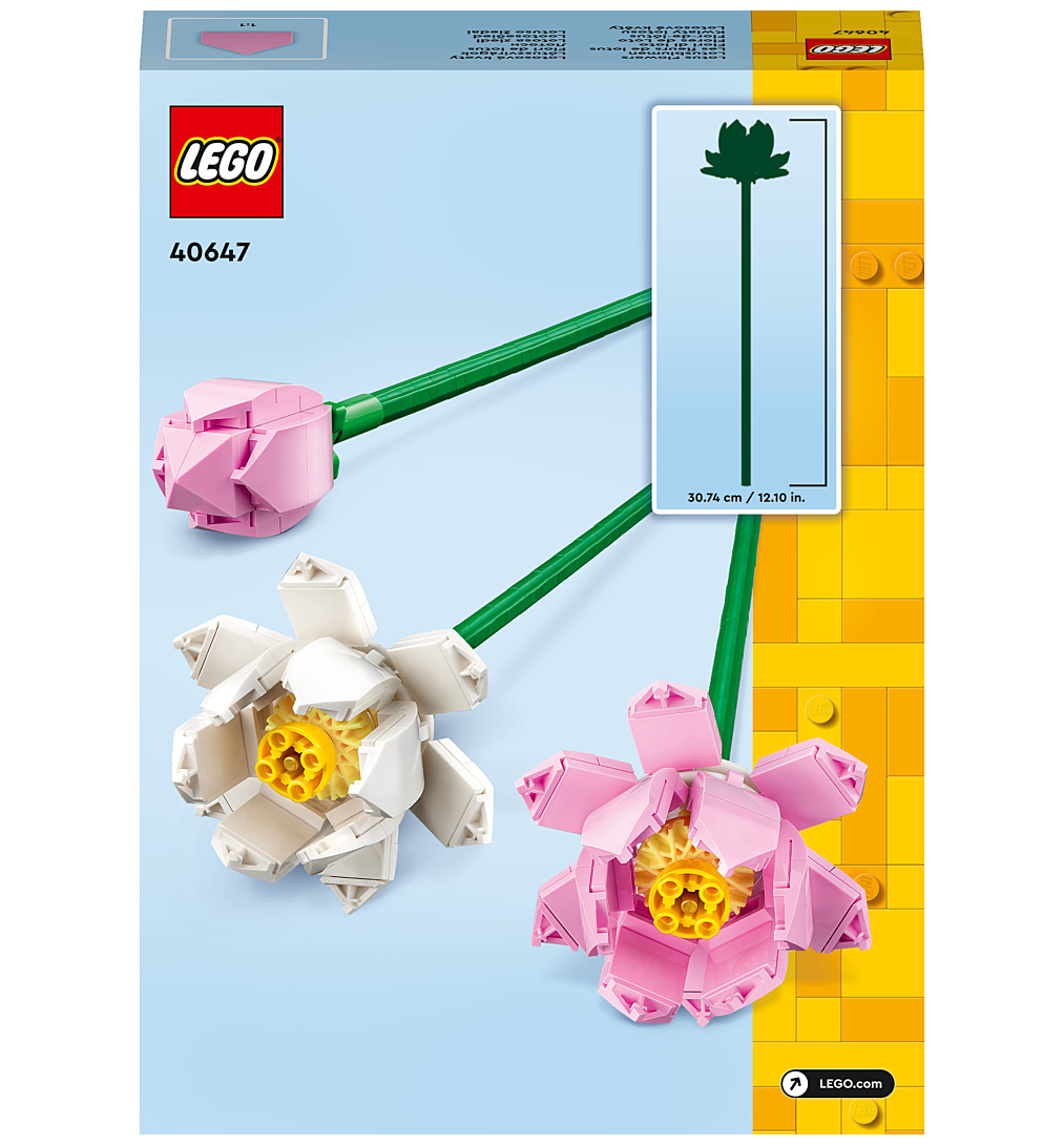 Recréez une merveille de la nature avec le set de construction LEGO Les fleurs de lotus (40647). Cette interprétation LEGO de la fleur mondialement célèbre représente 2 lotus en fleurs et un bouton dans de délicates teintes de rose et de blanc. Des nuances pastel polyvalentes pour chaque pièce : l'une de ces fleurs arbore un rose délicat qui se marie harmonieusement avec son bouton floral, tandis que l'autre revêt une teinte blanche, pour une décoration florale parfaitement adaptée tant au bureau qu'aux accessoires de chambre. Explorez des arrangements floraux plus vastes : pour confectionner un bouquet de fleurs encore plus saisissant, fusionnez ces fleurs de lotus avec d'autres végétaux LEGO ou des ensembles issus de la riche collection botanique LEGO. Les fleurs sont dotées de longues tiges vertes, qui permettent de les disposer dans un vase. Ce superbe bouquet LEGO est une belle idée de cadeau pour un anniversaire, les fêtes ou toute autre occasion. Il peut être combiné avec d’autres sets de fleurs LEGO à construire (vendus séparément).