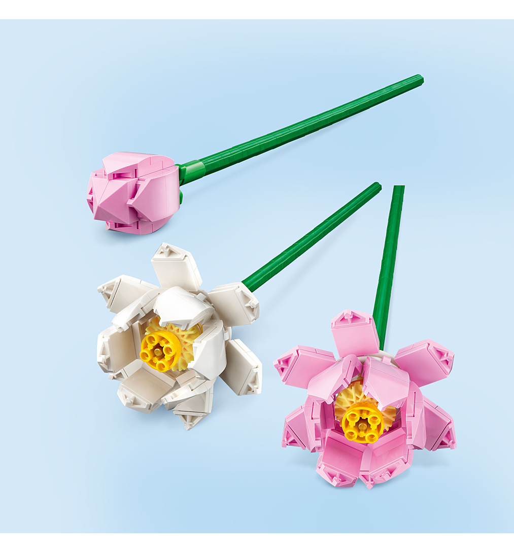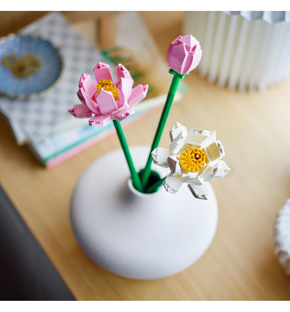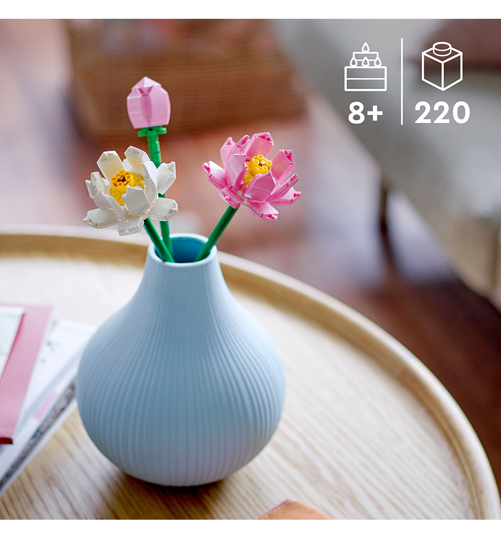 Recréez une merveille de la nature avec le set de construction LEGO Les fleurs de lotus (40647). Cette interprétation LEGO de la fleur mondialement célèbre représente 2 lotus en fleurs et un bouton dans de délicates teintes de rose et de blanc. Des nuances pastel polyvalentes pour chaque pièce : l'une de ces fleurs arbore un rose délicat qui se marie harmonieusement avec son bouton floral, tandis que l'autre revêt une teinte blanche, pour une décoration florale parfaitement adaptée tant au bureau qu'aux accessoires de chambre. Explorez des arrangements floraux plus vastes : pour confectionner un bouquet de fleurs encore plus saisissant, fusionnez ces fleurs de lotus avec d'autres végétaux LEGO ou des ensembles issus de la riche collection botanique LEGO. Les fleurs sont dotées de longues tiges vertes, qui permettent de les disposer dans un vase. Ce superbe bouquet LEGO est une belle idée de cadeau pour un anniversaire, les fêtes ou toute autre occasion. Il peut être combiné avec d’autres sets de fleurs LEGO à construire (vendus séparément).