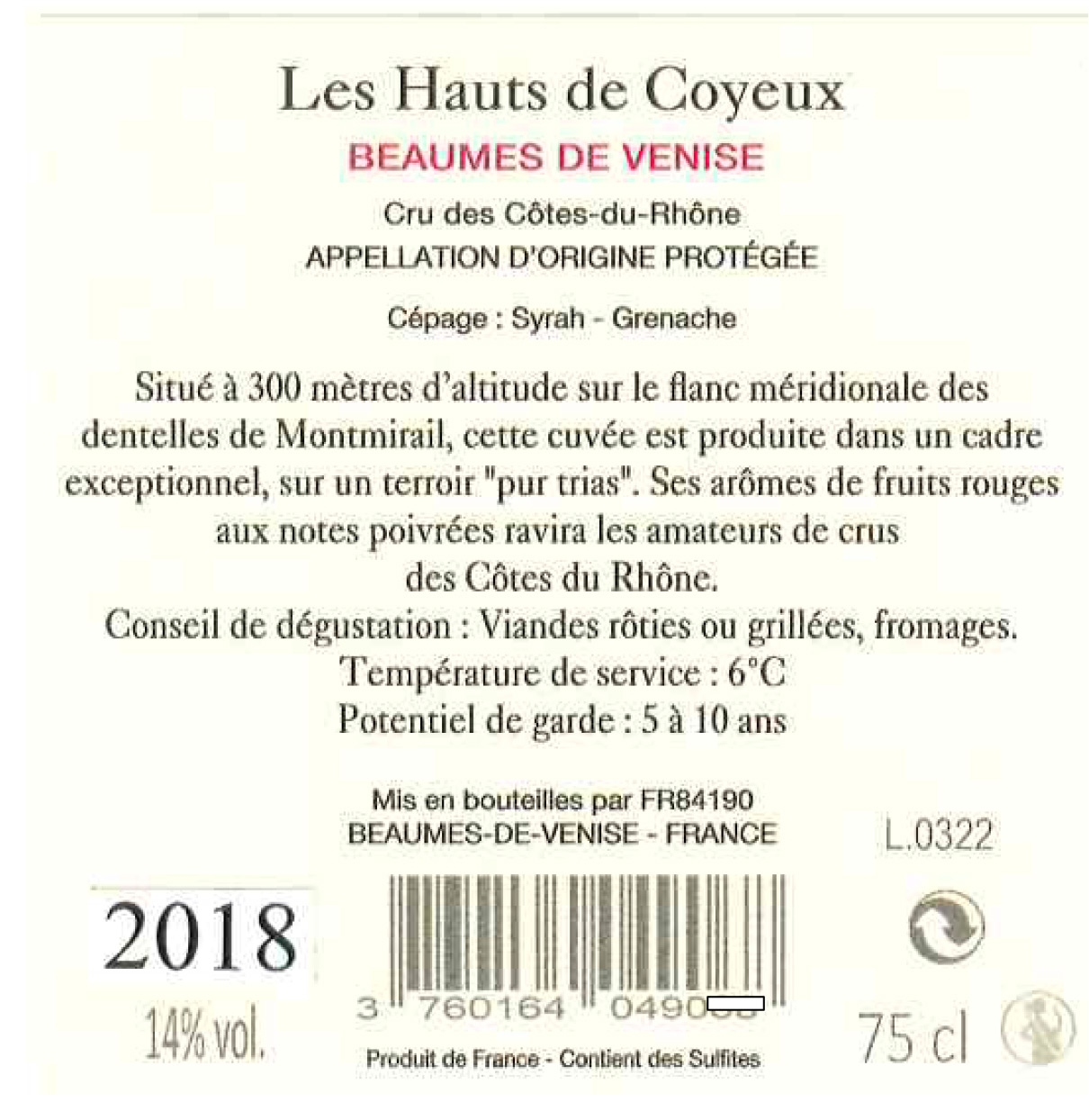 | Libellé | Les Hauts de Coyeux, 2018 - Beaumes-de-Venise AOP - Rouge - 75 cl |