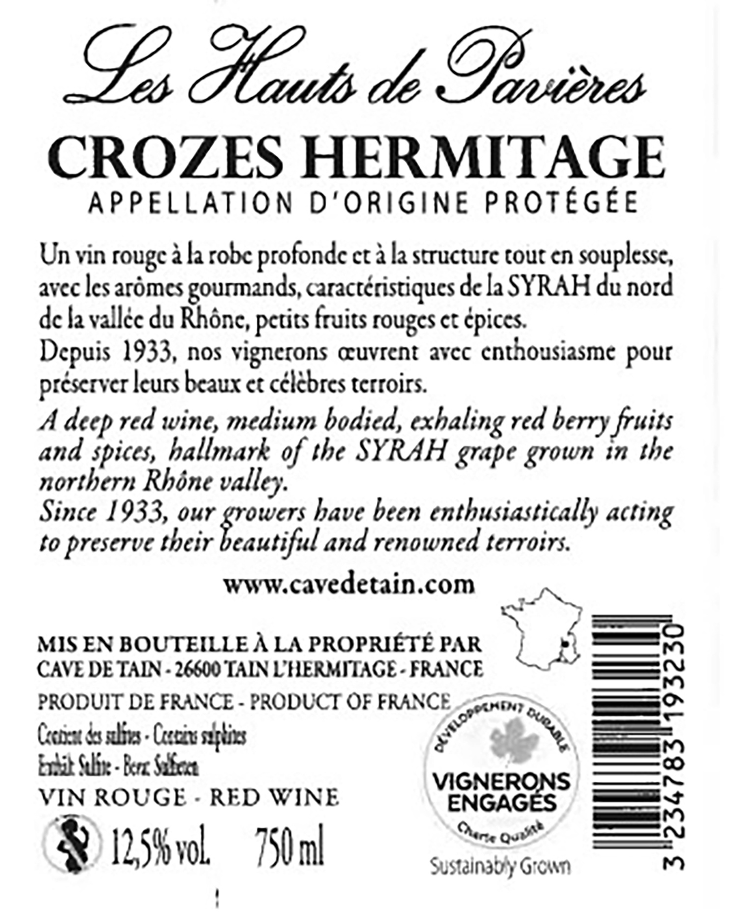 | Libellé | Les Hauts de Pavières, 2023 - Crozes-Hermitage AOP - Rouge - 75 cl |