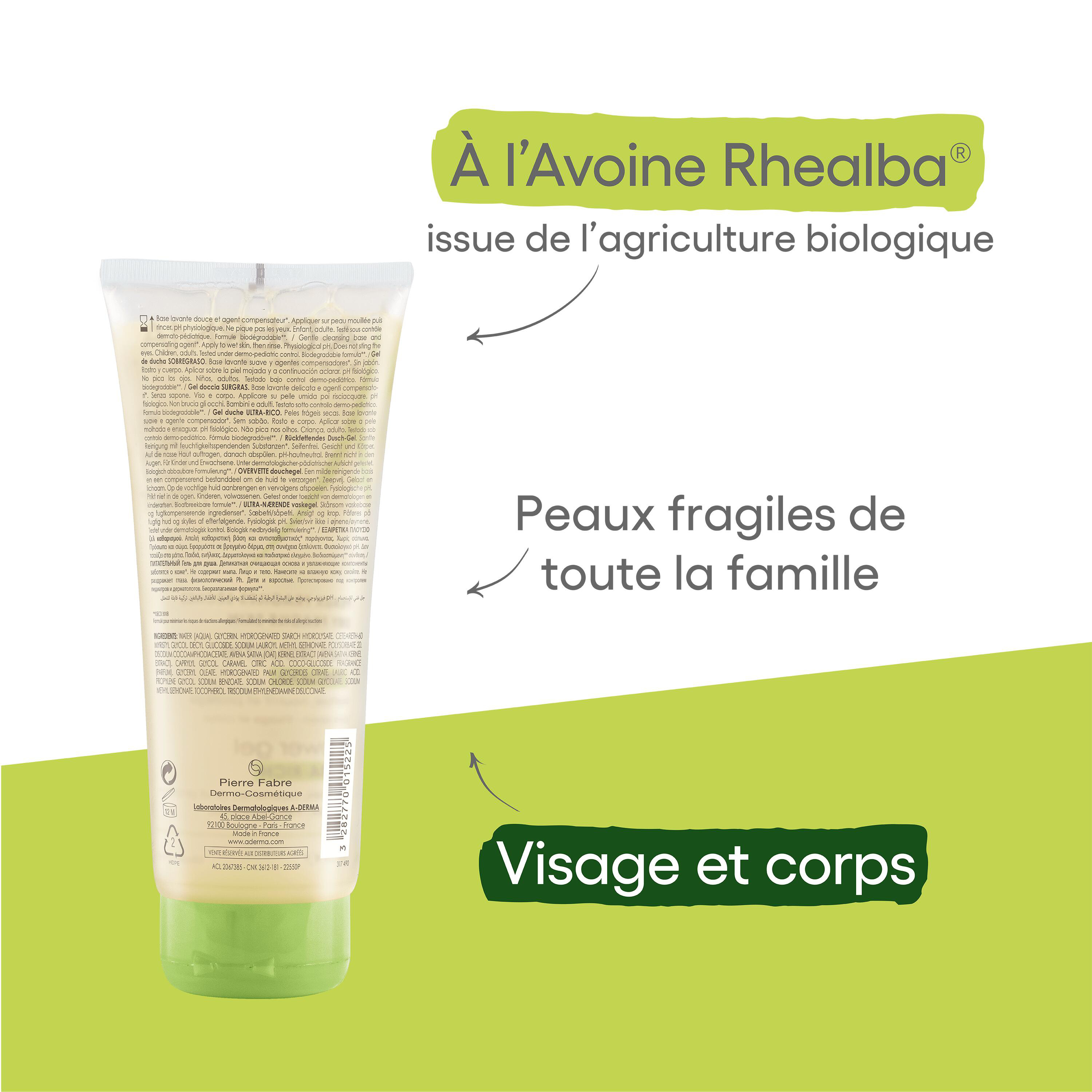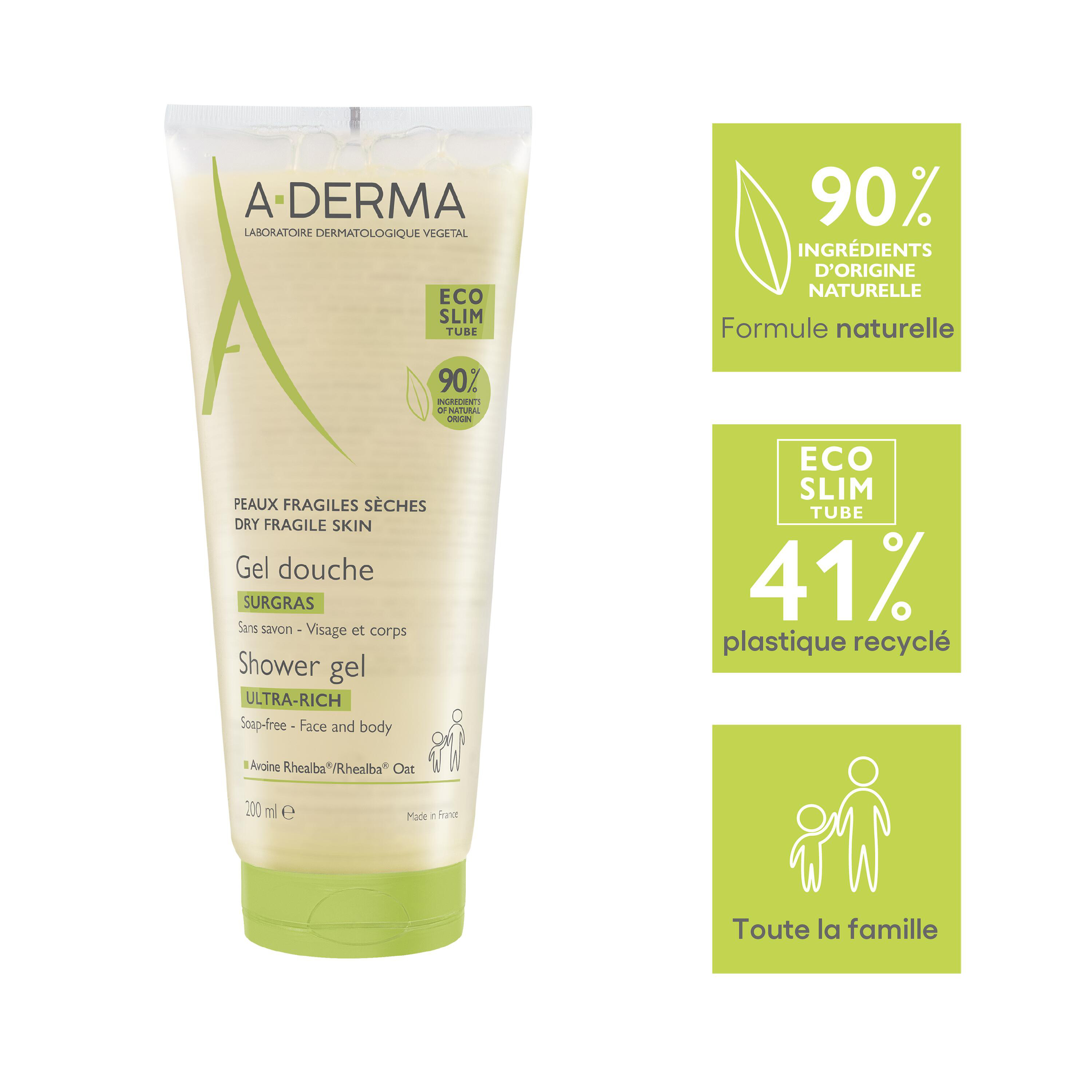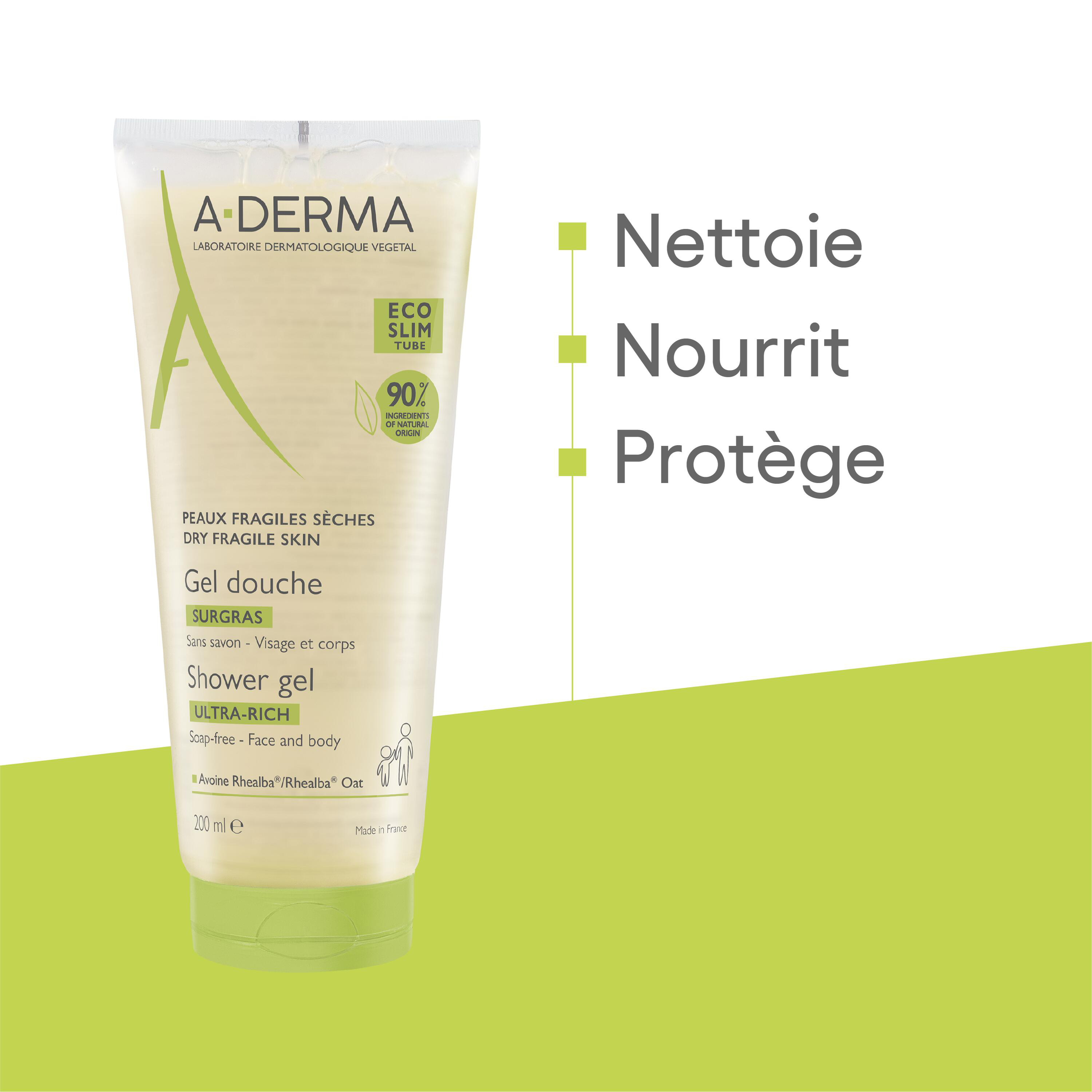 Expert de l’hygiène des peaux fragiles, le Laboratoire dermatologique végétal ADERMA répond au besoin des peaux sèches avec ce gel douche. Ce soin lavant composé à 90% d'ingrédients d'origine naturelle** nettoie en douceur, nourrit et protège. Enrichi en émollients d'origine naturelle, il tire son efficacité et ses vertus apaisantes et relipidantes de l’innovation Clean Care Complex™. Cette association comprend une base lavante douce et un agent compensateur, pour nettoyer sans agresser ni dessécher. Sa formule fondante, à l’extrait de Plantules d’Avoine Rhealba® apaisante adoucit la peau. Biodégradable*, sans savon, le Gel douche surgras est adapté à toute la famille et s’applique sur le visage et le corps. Sous la douche, il se transforme en une mousse aérienne, au parfum léger, qui se rince facilement. La peau sèche est nourrie***, apaisée**** et protégée Avoine Rhealba® issue de l’agriculture biologique. Flacon contenant 50% de plastique recyclé. Info Vegan : sans ingrédient d'origine animale. * Selon la norme OCDE 301B ** Contient 90% d'ingrédients d'origine naturelle *** La peau est nourrie pour 97% des sujets . **** La peau est apaisée pour 100% des sujets. Résultat obtenu après étude de la tolérance à l’usage enfants et efficacité (33 sujets)