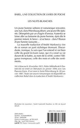 «Les Nuits blanches», c'est d'abord un vrai roman d'amour. Un jeune homme solitaire et romanesque rencontre, une nuit, dans Pétersbourg désert, une jeune fille éplorée. Désespérée par un chagrin d'amour, Nastenka se laisse aller au fantasme du jeune homme, amoureux depuis le premier instant, le berce — et se berce — dans l'illusion, jusqu'à ce que... le fiancé revienne et qu'elle se jette dans ses bras. Dès lors, comme le note Michel Del Castillo dans sa lecture, tout est soudain "marqué au sceau de l'inauthenticité".