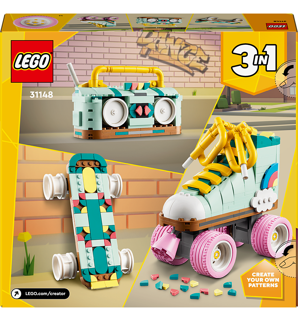 Les enfants créatifs de 8 ans et plus peuvent voyager dans le passé avec Les Patins à Roulettes Rétro LEGO Creator (31148). Ce jouet LEGO Creator 3-en-1 rétro offre aux enfants 3 expériences de construction et de jeu différentes avec les mêmes briques. L'ensemble comprend un roller LEGO avec 4 roues pivotantes roses, un frein rose et des lacets épais jaunes. Divers éléments colorés sont également inclus pour que votre enfant puisse décorer le talon de la chaussure avec ses propres motifs. Votre enfant peut construire le roller jouet et ensuite transformer le modèle en une planche à roulettes miniaturisée colorée ou en un ghetto-blaster rétro avec une antenne courte. Les 3 modèles sont des points de mire spectaculaires qui peuvent être exposés dans la chambre d'enfant comme décoration rétro ou sur le bureau. Les ensembles 3-en-1 offrent aux enfants aux intérêts variés des heures de plaisir de jeu avec un large choix de modèles. Cet ensemble LEGO Creator 3-en-1 Roller est un cadeau d'anniversaire créatif pour les filles et les garçons de 8 ans.