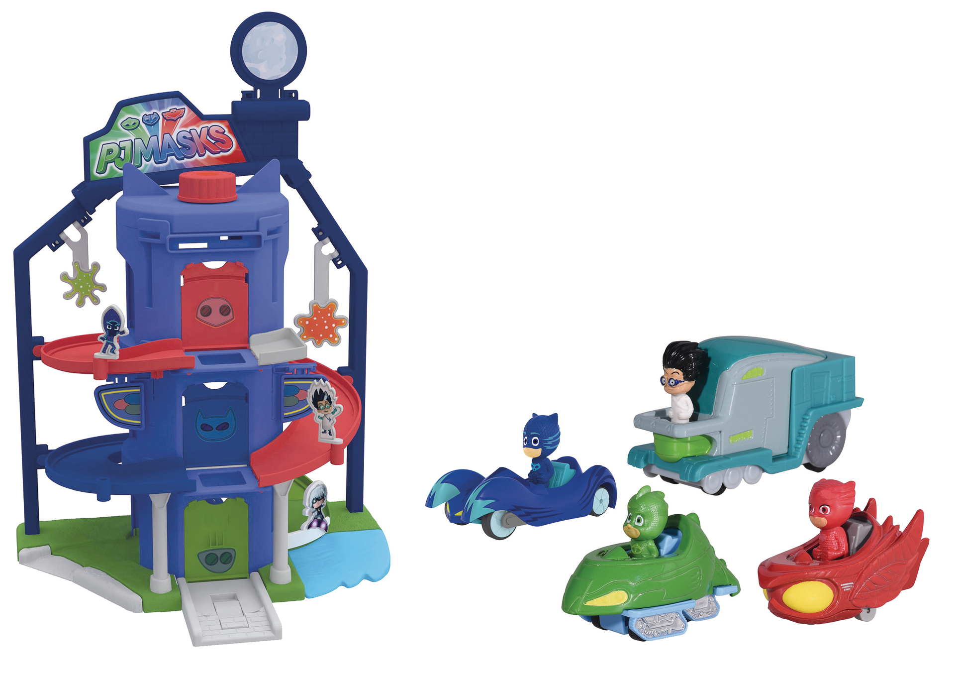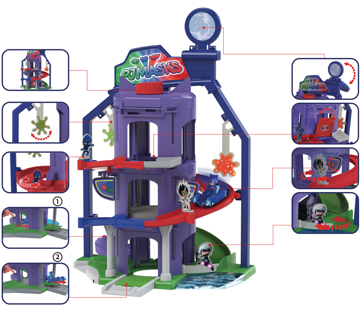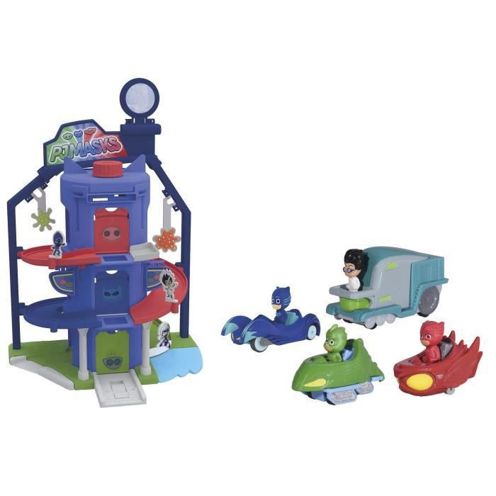 Quartier Général des PJ Masks avec différentes fonctions de jeu : lanceur, ascenseur, saut. 4 véhicules inclus : Cat-Car, Gekko-Mobile, Owlette-Glider, Romeos-Lab._x000D_