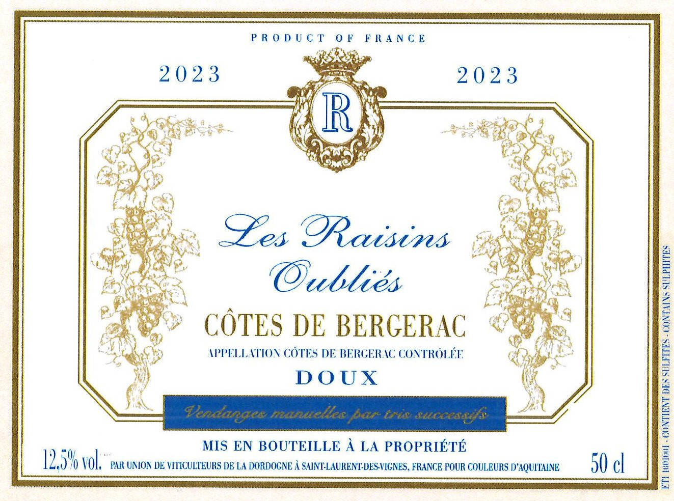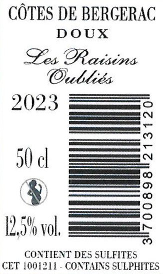 | Libellé | Les Raisins Oubliés, 2023 - Côtes de Bergerac AOP - Blanc Moelleux - 50 cl |