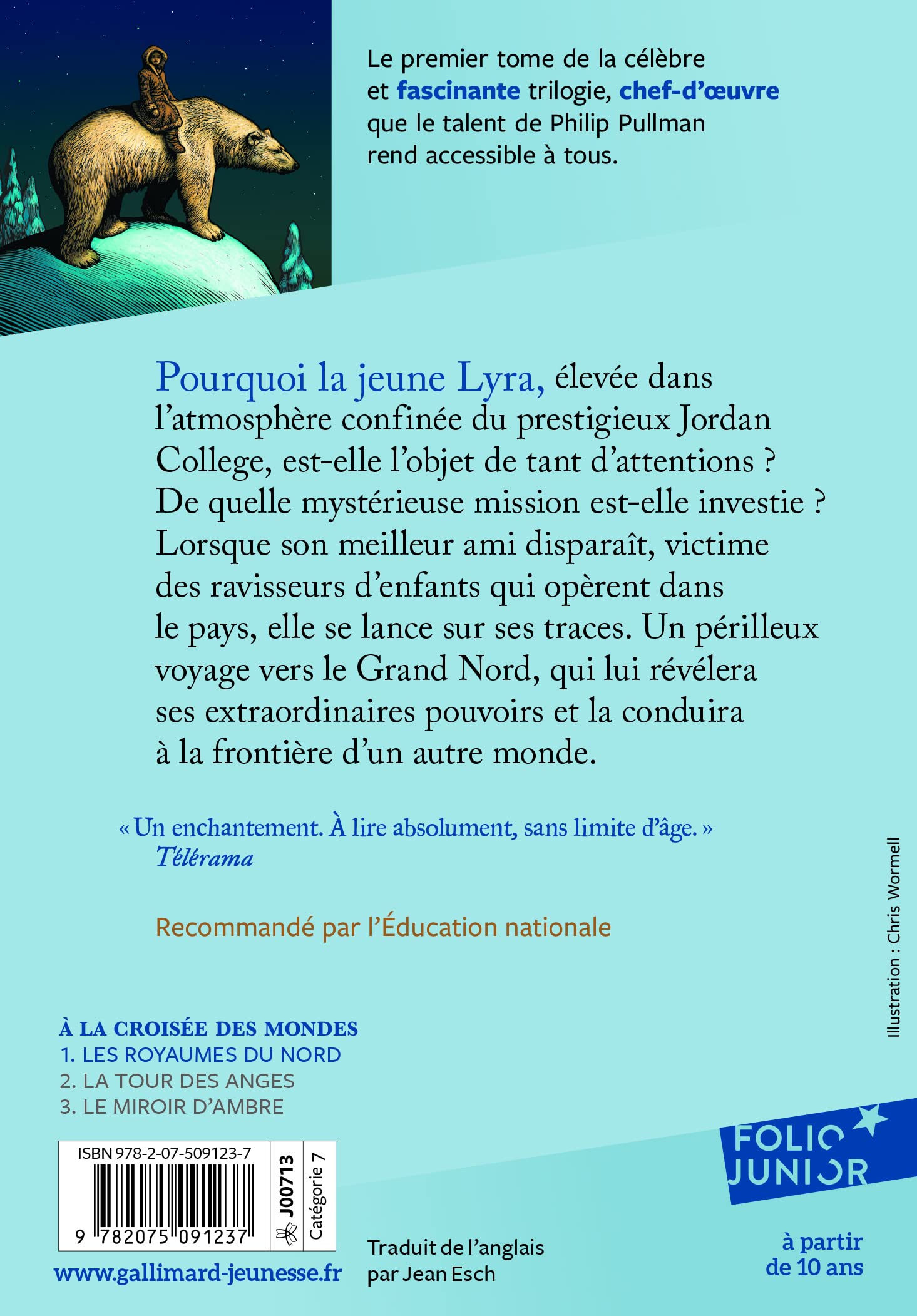 Pourquoi la jeune Lyra, élevée dans l'atmosphère confinée d'une prestigieuse université anglaise, est-elle l'objet de tant d'attentions ? De quelle mystérieuse mission est-elle investie ? Lorsque son meilleur ami, Roger, disparaît, victime des ravisseurs d'enfants qui opèrent dans tout le pays, elle n'hésite pas à se lancer sur ses traces... Un périleux voyage vers le Grand Nord, périlleux et exaltant, qui lui révèlera ses extraordinaires pouvoirs et la conduira à la frontière d'un autre monde. Titre recommandé par l'Éducation nationale en classe de 6e et 3e