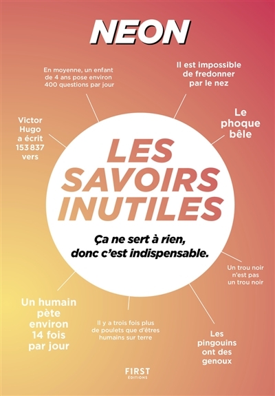 Certes, savoir que le coeur bat 36 millions de fois par an, que Lara Croft a fait la une de Libé en 1997 ou encore que Asatru est le nom d'une spiritualité viking ne vous servira sans doute pas à grand-chose dans la vie de tous les jours. Et pourtant, voulez-vous vraiment passer à côté de toute cette science ? Depuis 2013, Les Savoirs Inutiles de Néon vous servent la crème de l'inutilité, maintenant réunis en un volume, pour votre plus grand plaisir.