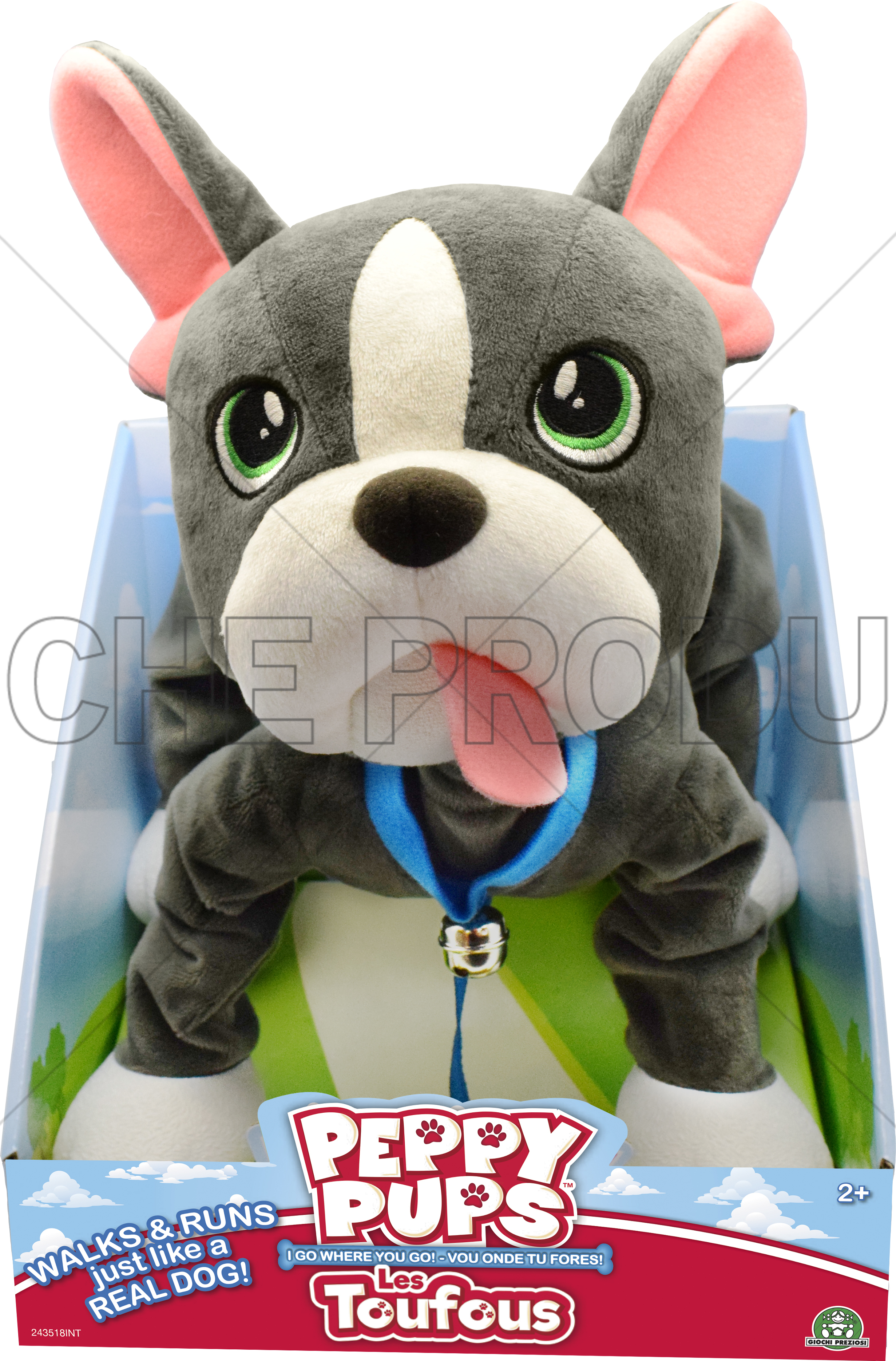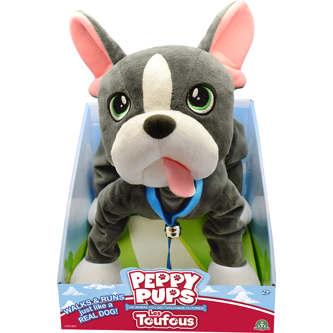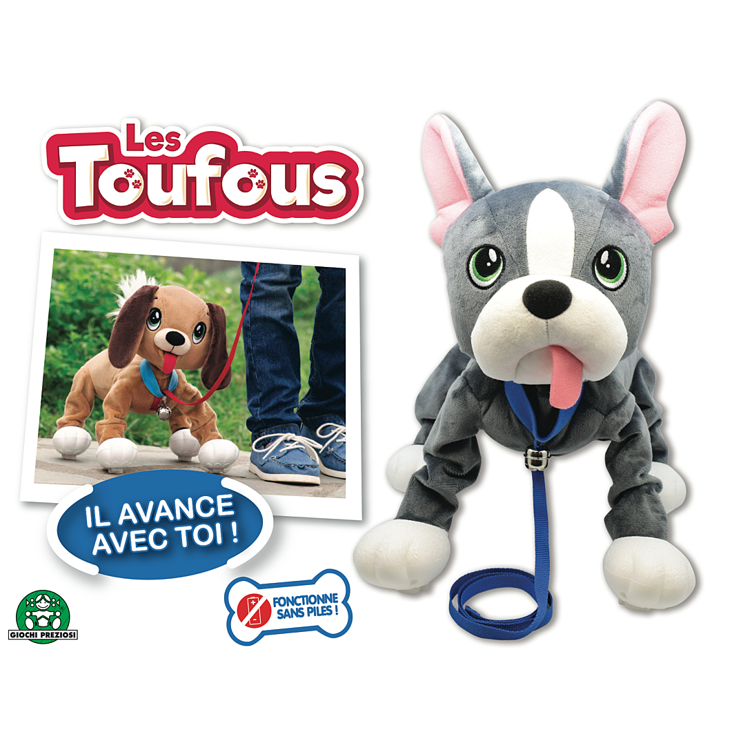 | Plus produit | ILS SONT TOUFOUS ! Les Toufous, des p\'tits toutous qui courent partout ! COMME UN VRAI CHIEN : Il marche et court avec toi, comme un vrai chien !\n IL TE SUIT PARTOUT : Il adore aller se promener! Il rebondit joyeusement derrière toi ! JOUET À TIRER : Grâce à la laisse incluse et au grelot, c\'est trop rigolo de promener ton Toufous! SANS PILES : Fonctionne sans piles ! Comme un vrai chien ! |