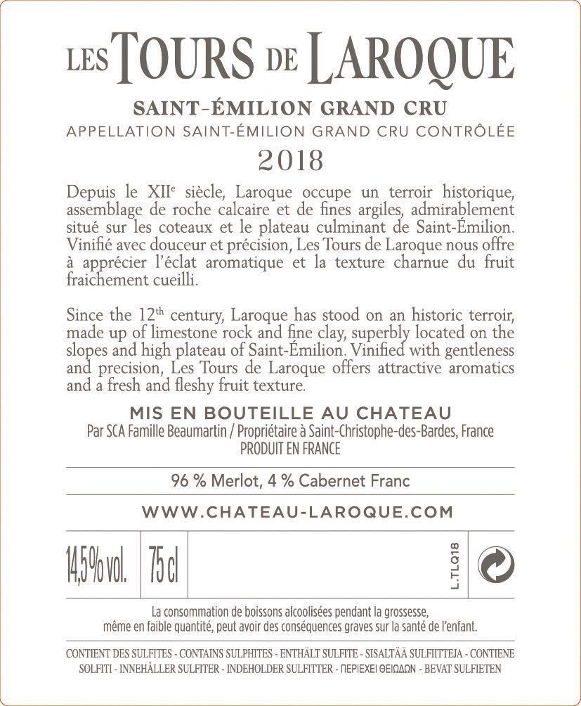 | Libellé | Les Tours de Laroque, 2018 - Saint-Emilion Grand Cru A.O.P. - Rouge - 75 cl |