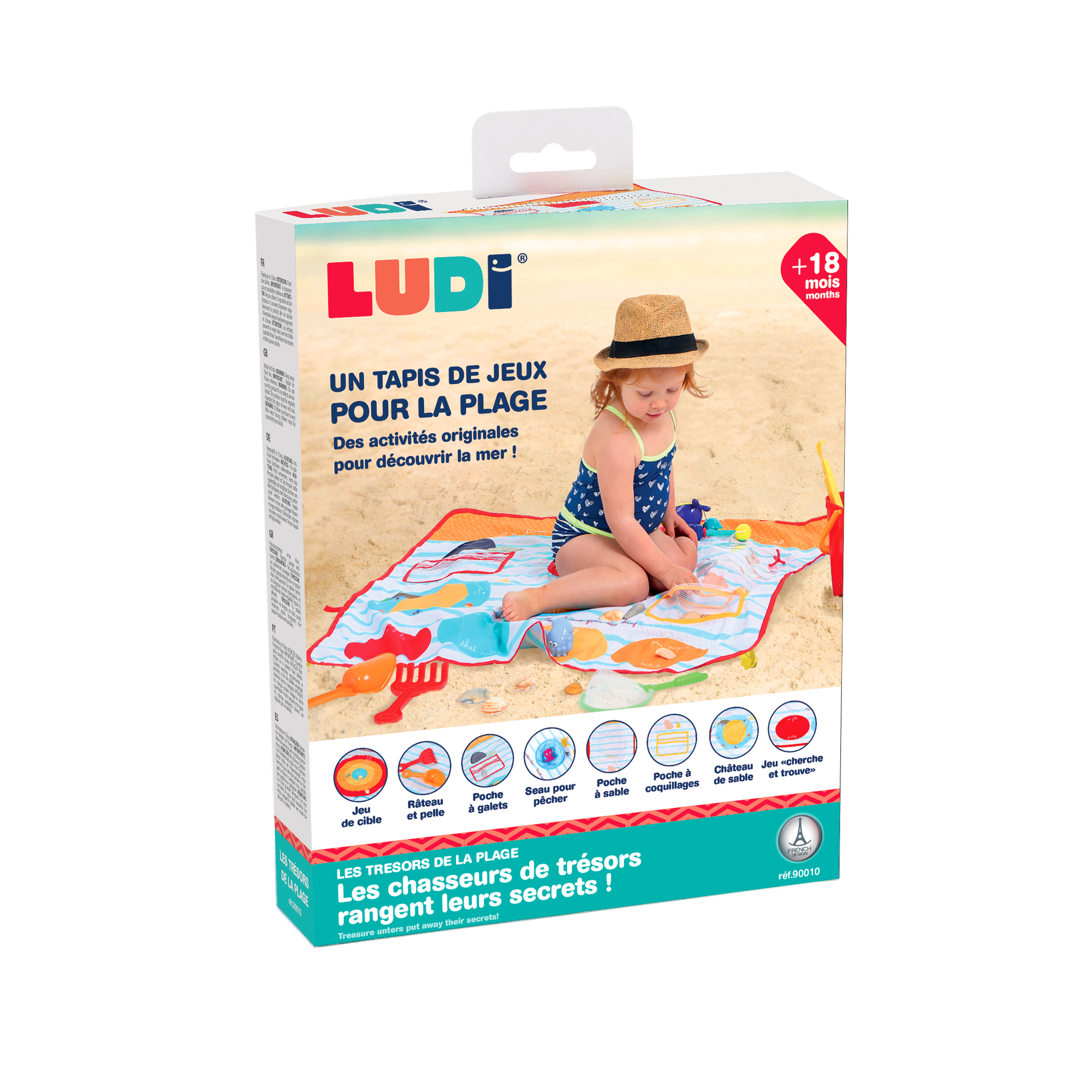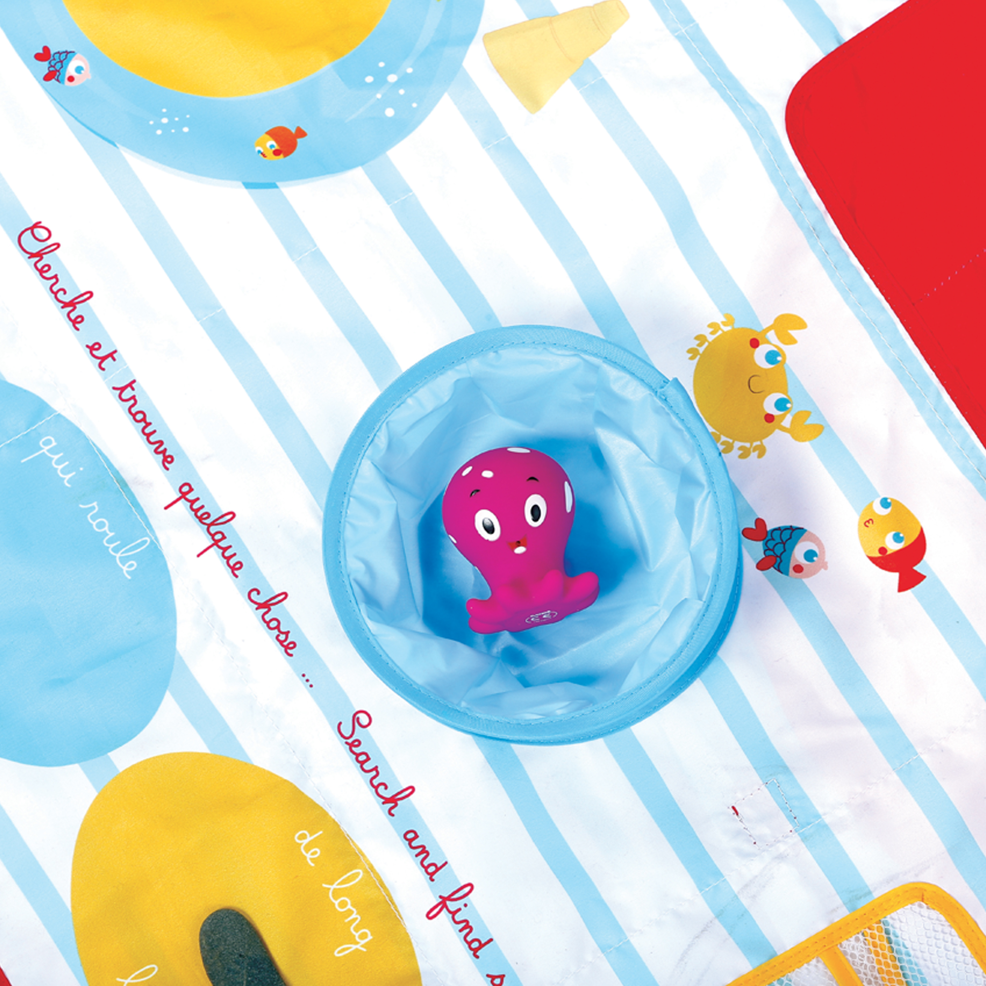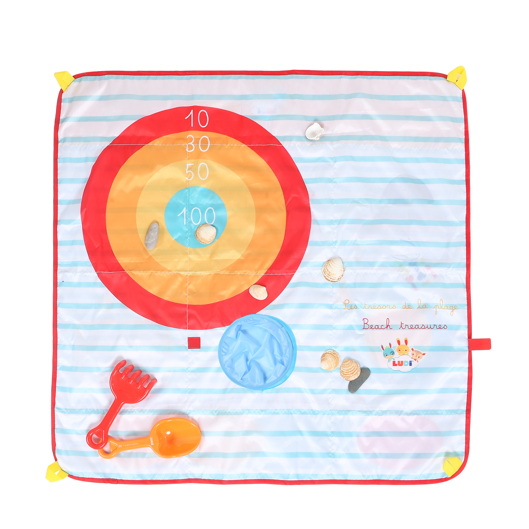 Les chasseurs de trésors rangent leurs secrets ! Lors des escapades à la plage en famille, il n’est pas rare de jouer ensemble et de se lancer des défis. Ce tapis de jeu réversible propose des activités originales pour découvrir la mer. Un bon moyen de lier le jeu à l’éducatif ! Les enfants doivent trouver 8 petits trésors autour d’eux et les ranger dans les poches dédiées. Ils pourront ensuite les garder pour exposer leurs découvertes ! Retournez le tapis et retrouvez un jeu de cible. Tout le monde pourra s’exercer à lancer et à viser le centre pour remporter tous les points. Ce tapis inédit est accompagné de 4 fixations au sol, un râteau, une pelle et une petite cuvette amovible tel un seau en tissu. Les enfants seront heureux de jouer avec un point d’eau à proximité. Il est impossible de s’ennuyer ! Pensé pour voyager avec la famille Le tapis « Les trésors de la plage » est conçu avec un tissu résistant et imperméable. Il se plie facilement avec tous ses accessoires ! Léger et peu encombrant une fois rangé dans son sac, il se glisse facilement sous la poussette et suit partout la famille dans ses déplacements. Adapté pour les enfants de plus de 18 mois. Dimension : 90 x 90 cm. 100 % polyester. Nettoyage simple avec un chiffon humide.