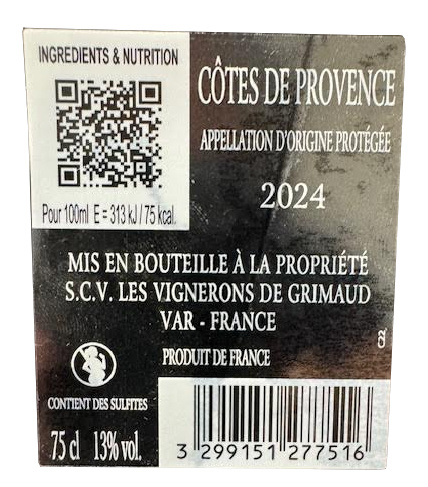 | Libellé | Les Vignerons de Grimaud, 2025 - Côtes de Provence AOP - Blanc Sec - 75 cl |
