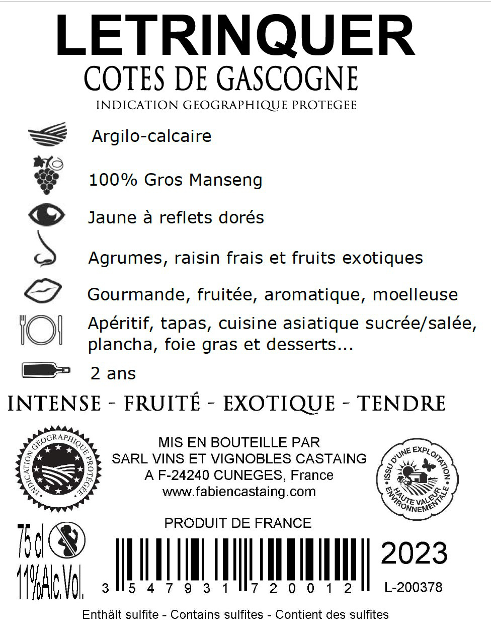 Libellé Letrinquer aux Vols de Grues, 2023 - Côtes de Gascogne IGP - Blanc Moelleux - 75 cl