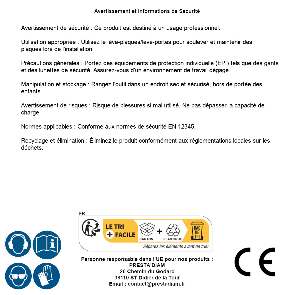 UtilisationPour utiliser le lève-plaque, placez-le sous la plaque ou la porte à soulever. Ajustez la hauteur selon vos besoins et verrouillez en place. Assurez-vous que l'outil est stable avant de commencer l'installation.