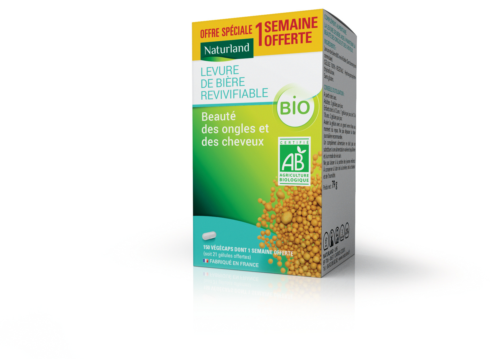 Naturland Levure de Bière Revivifiable Bio 150 Végécaps dont 21 Végécaps Offertes est un complément alimentaire à base de levure de bière qui aide à maintenir la beauté des ongles et des cheveux. Certifié Agriculture Biologique. Contrôle FR-BIO-01. Fabriqué en France.