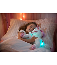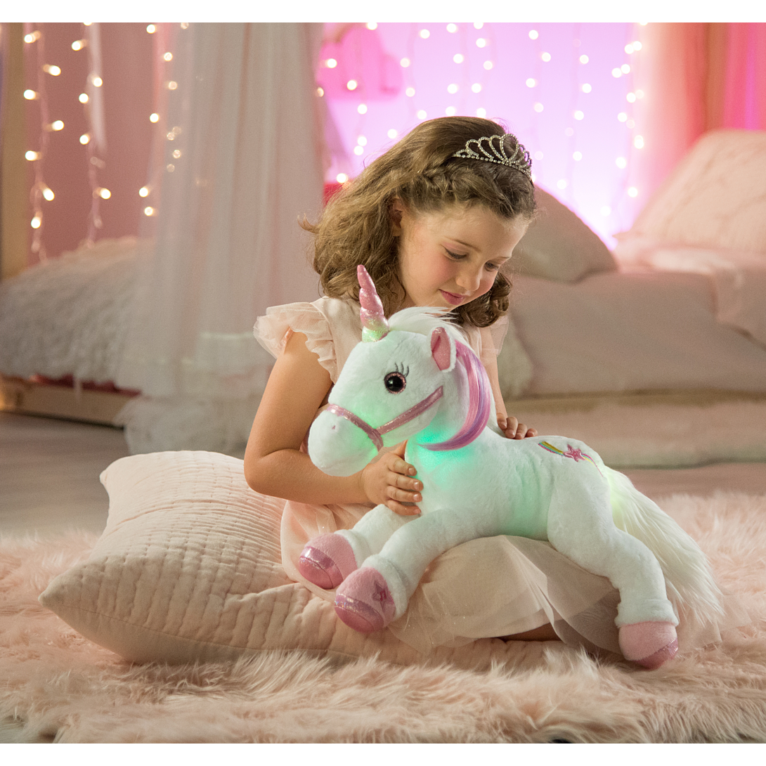 PELUCHE TRES DOUCE QUI S'ECLAIRE AUX COULEURS DE L' ARC EN CIEL, QUI EMET DES SONS FEERIQUES ET DONT LES YEUX S'ILLUMINENT
