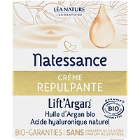 Un duo d'actifs unique enrichit cette crème de la gamme REPULPANTE:- L'Huile d'Argan bio, hydratante(1) , adoucissante, régénérante, anti-oxydante, est l'alliée parfaite pour aider à lutter contre le vieillissement cutané tout en apportant hydratation(1) et confort à la peau.- L'Acide hyaluronique naturel, reconnu pour ses propriétés anti-âge et hydratante(1), permet de restaurer l'élasticité et aide à stimuler les défenses cutanées. La Crème repulpante Lift'Argan® nourrit la peau pour une double action anti-âge sur les rides et la fermeté. Sa texture velours fond sur la peau pour un confort immédiat. Le visage est naturellement lissé et redensifié. EFFICACITÉ PROUVÉE :- Peau repulpée : 100%- Peau rajeunie : 95%- Rides et ridules estompées : 95%% de satisfaction - 21 femmes - 28 jours d'application biquotidienne