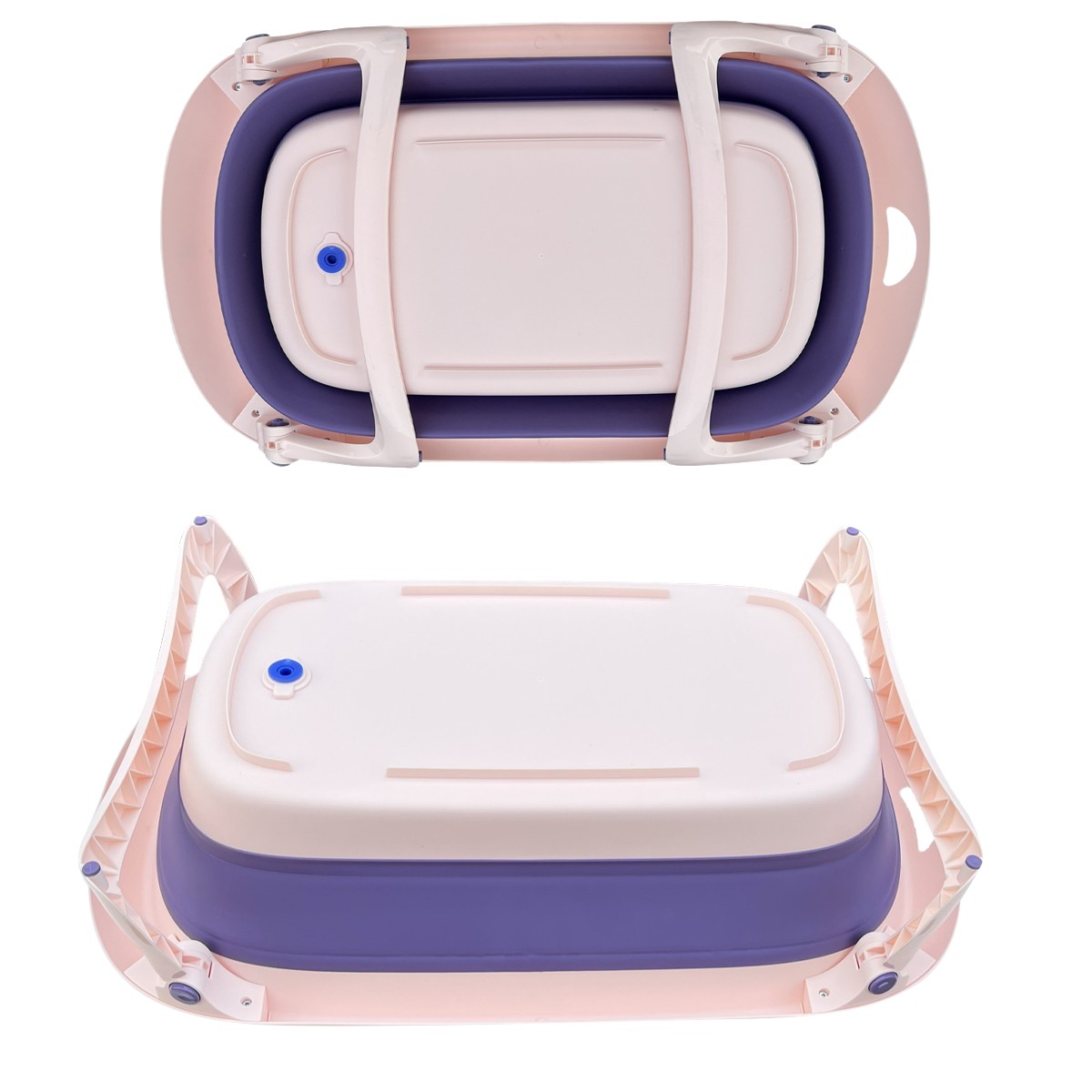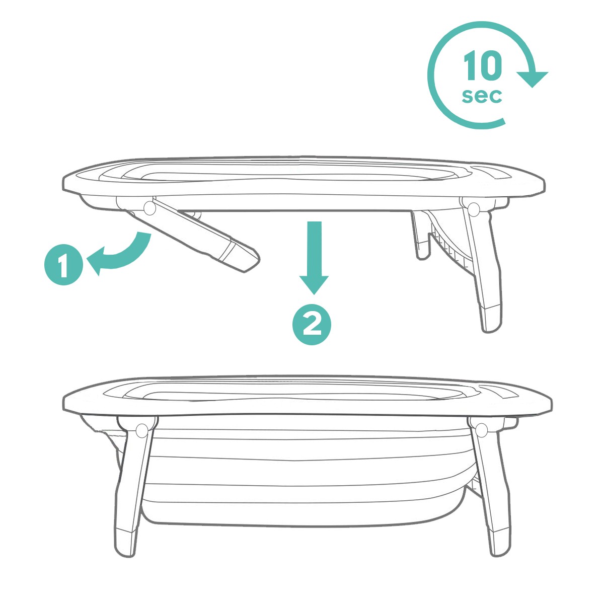 Baignoire spacieuse, pliable ultra-compacte, facile à ranger et à transporter grâce à sa poignée. Les parois souples de la baignoire se plient sur elles-même pour un gain de place maximum et les pieds se rabattent en appuyant les boutons pression situés aux extrémités.