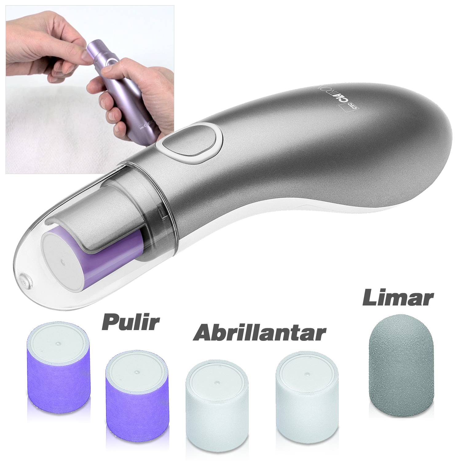 Système de soins des ongles pour un fini naturel et brillantPermet de prendre soin de ses ongles en 3 étapes : limer, polir et faire brillerUtilisation polyvalente sur les ongles des doigts et des orteilsConception ergonomique avec interrupteur marche/arrêt2 vitessesComprend 5 accessoires (2 x têtes de polissage, 2 x têtes de polissage, 1 x tête de classement)Couverture de protectionFonctionnement sur piles : 2 x 1,5 V AA (non incluses)