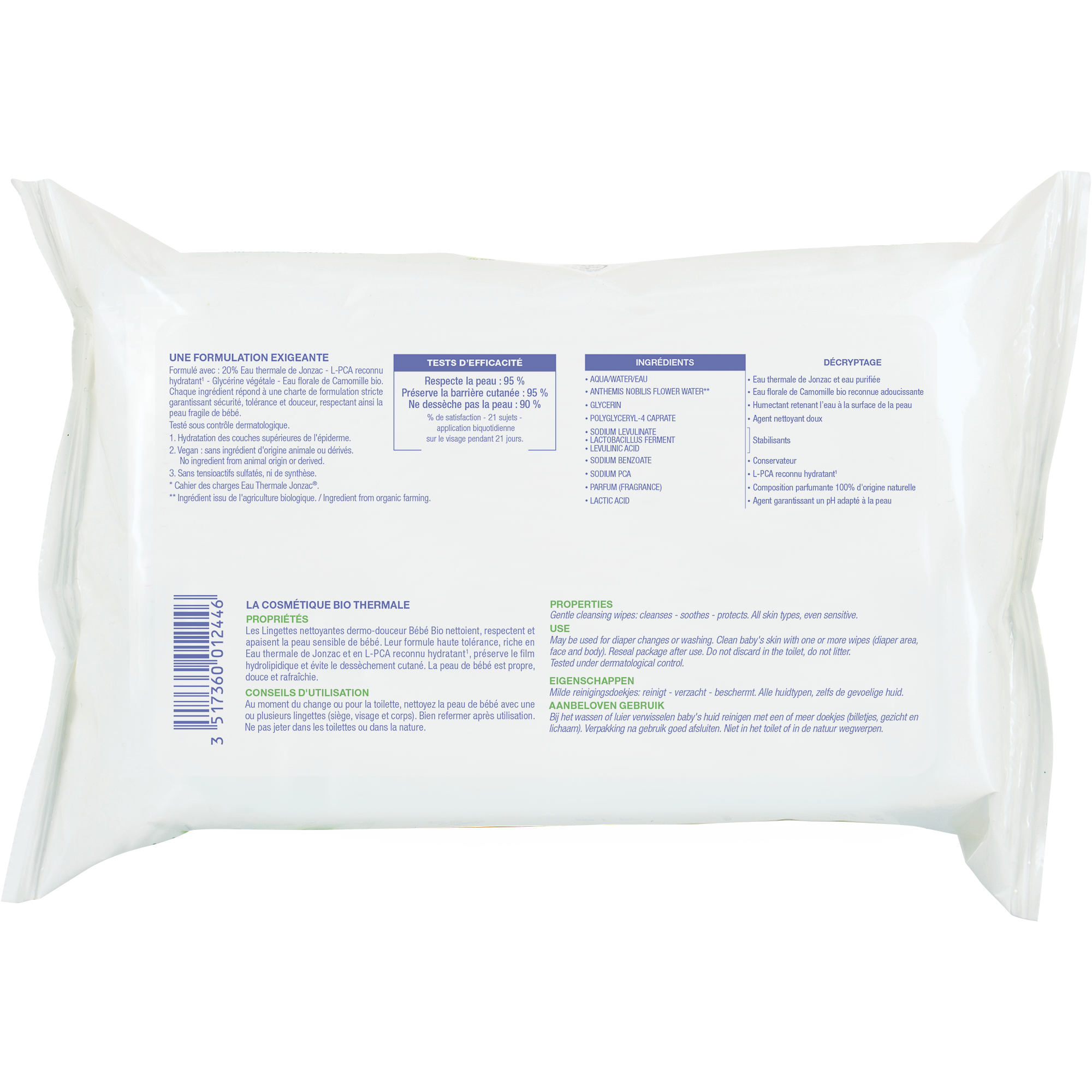Idéales à la maison ou en déplacement (voiture, vacances…), Eau de Jonzac Bébé Bio Lingettes Nettoyantes Dermo-Douceur 40 Lingettes nettoient en douceur le siège, le visage et le corps de bébé. Ces lingettes nettoient et apaisent les peaux sensibles tout en respectant la peau. La formule hypoallergénique de ces lingettes est riche en eau thermale de Jonzac et en actif L-PCA, pour préserver le film hydrolipidique et éviter le dessèchement cutané, mais aussi en glycérine végétale et eau florale de camomille pour hydrater et apaiser la peau. La peau de bébé est douce, propre et fraîche. 0% paraben, alcool, edta, peg, phtalate, phénoxyethanol. Haute tolérance, testées dermatologiquement, formulées et testées pour minimiser les risques de réactions allergiques. 99% du total des ingrédients sont d'origine naturelle. 11% du total des ingrédients sont issus de l'agriculture biologique.
