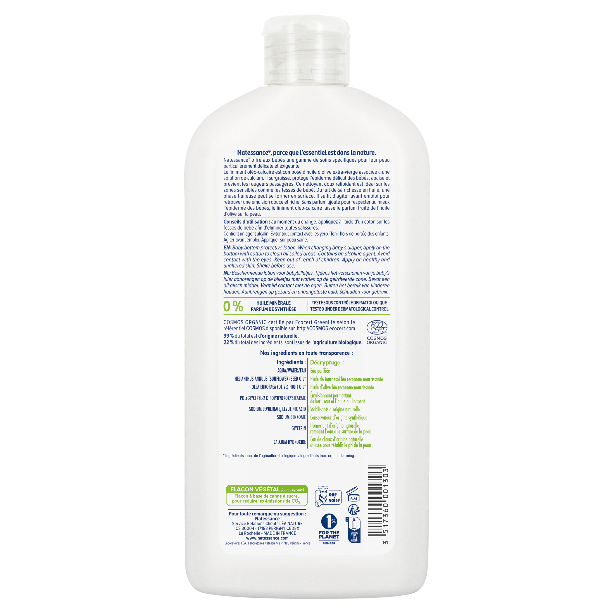 Le Liniment Oléo-calcaire Natessance est composé d'huile d'olive associée à une solution de calcium. Il surgraisse, protège l'épiderme délicat des bébés et prévient des rougeurs passagères. Ce nettoyant doux relipidant est idéal sur les zones sensibles comme les fesses de bébé. De par sa richesse en huile, une phase huileuse peut se former en surface. Il suffit d'agiter avant emploi pour retrouver une émulsion douce et riche. Sans parfum ajouté pour respecter au mieux l'épiderme des bébés, le liniment oléo-calcaire laisse le parfum fruité de l'huile d'olive sur la peau.