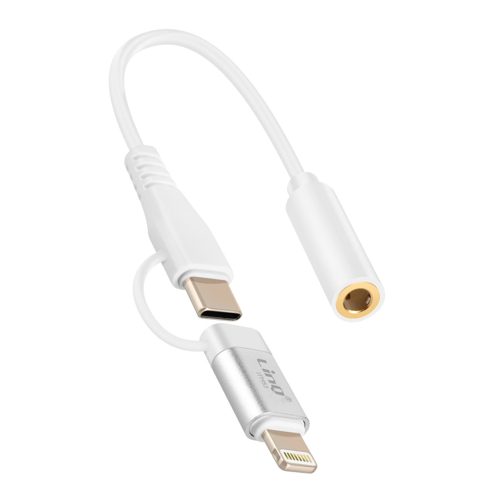 LinQ Adaptateur Audio Jack 3.5mm Femelle vers Lightning et USB C Mâle Blanc