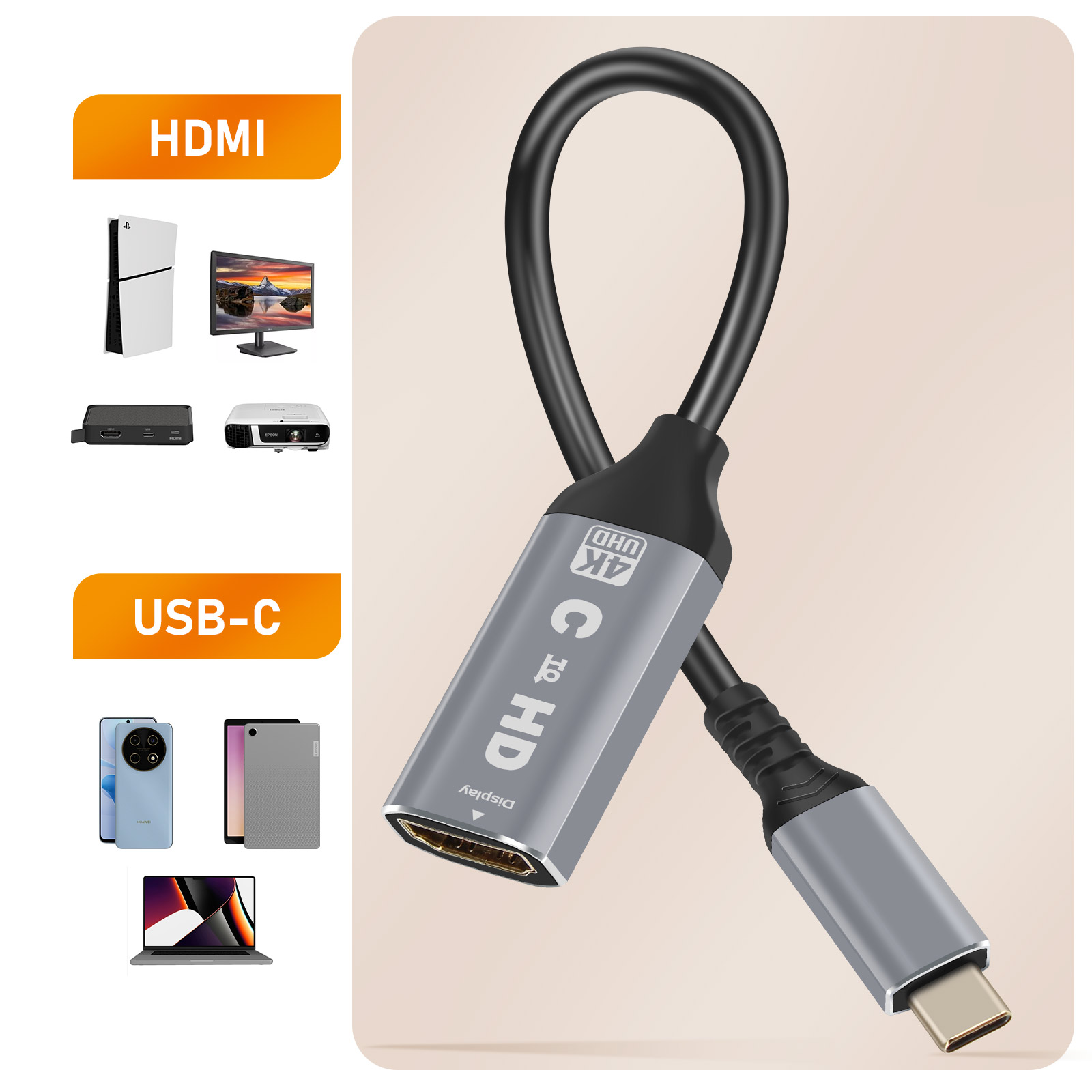 Adaptateur vidéo USB C vers HDMI de LinQ. Connecte vos appareils USB-C à une TV, un moniteur, un projecteur en Ultra HD 4K. Qualité d'image nette et fluide (4Kx2K). Conception en alliage d'aluminium et câble renforcé. Format compact, facile à transporter. Plug and Play.