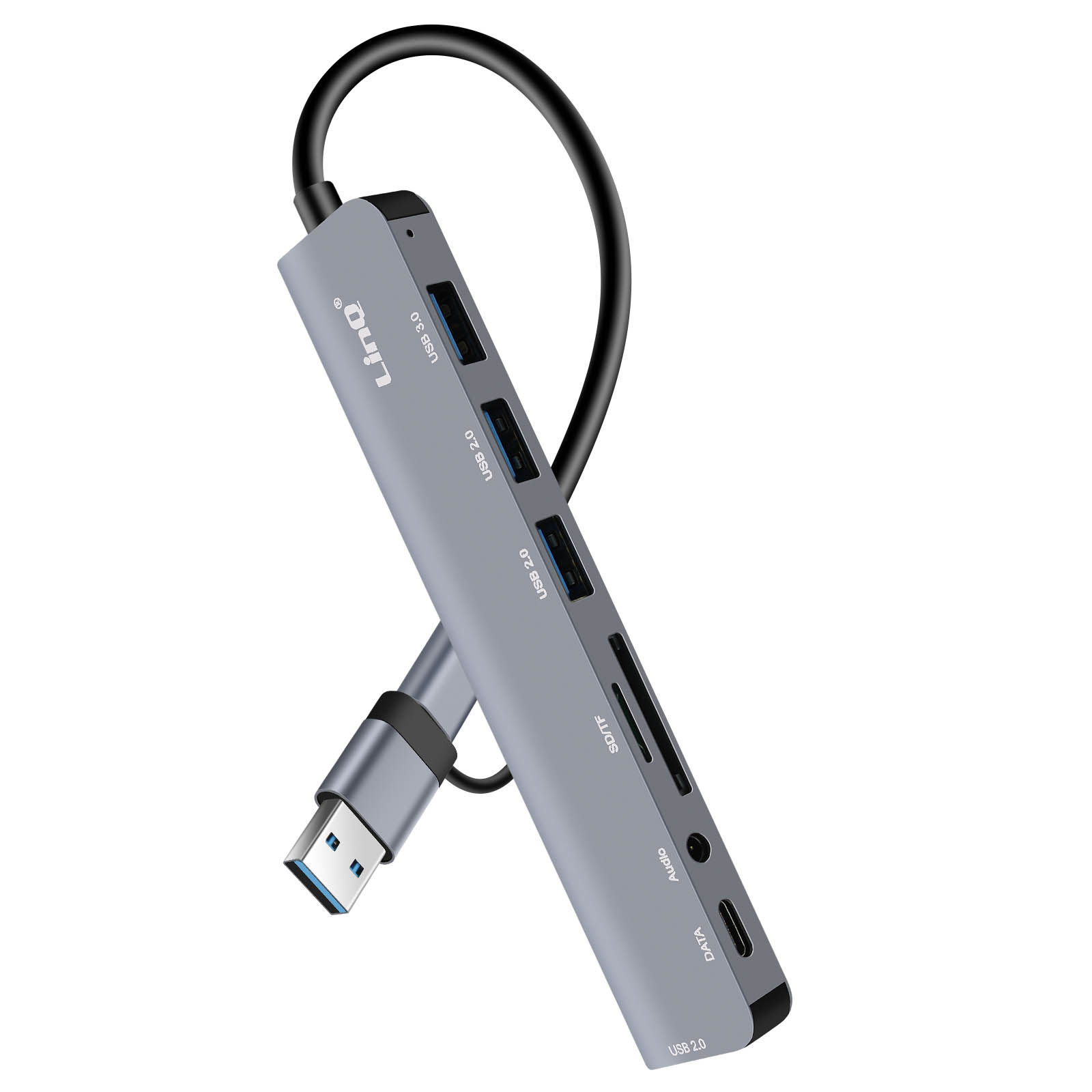 Passer le carrousel d'imagesHub USB 8 en 1 de la marque LinQ. Double connecteur USB-C et USB-A. Prend en charge la fonction OTG pour connecter des périphériques externes à vos appareils mobiles. Intègre 8 ports polyvalents, incluant USB 2.0, USB 3.0, SD, TF et un port jack 3,5 mm. Assure une vitesse de transfert rapide jusqu'à 5 Gbps. Le lecteur de cartes SD et TF. Son design compact et léger facilite le transport et l'utilisation en déplacement.
