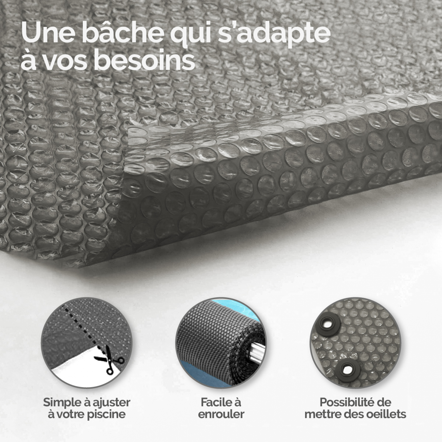 La bâche à bulles Linxor est disponible pour la plupart des piscines rectangulaires ou carrées. En absorbant la chaleur du soleil et en la transmettant à votre piscine, cette bâche évite les déperditions de chaleur et maintient la température de l'eau : une piscine non protégée par une bâche à bulles perd entre 4 et 5°C par nuit, contre 1 ou 2°C maximum pour une piscine protégée. Cette bâche à bulles possède également deux autres fonctions : elle réduit considérablement l'évaporation d'eau jusqu'à 90 % et protège votre bassin des pollutions extérieures et autres impuretés (feuilles, insectes, poussières). D'une épaisseur de 300 microns et réalisée en PE alvéolé, un matériau robuste et inaltérable, la bâche à bulles se veut être traitée anti-UV et traitée anti-cryptogamique, c'est-à-dire sans moisissures et résistante dans le temps. Toutes nos bâches à bulles ne possèdent ni bords ni oeillets, ainsi, vous pouvez ajuster la bâche à votre piscine à la forme ou dimension souhaitée avec de simples ciseaux. Vous pouvez cependant y ajouter des oeillets afin de pouvoir attacher la bâche à bulles à un enrouleur sans risque d'altérer sa qualité. Aucun risque de déchirure ou d'effilochement. Cette bâche s'adapte à vos besoins. Existe en plusieurs tailles. Deux coloris disponibles : bleu ou gris.
