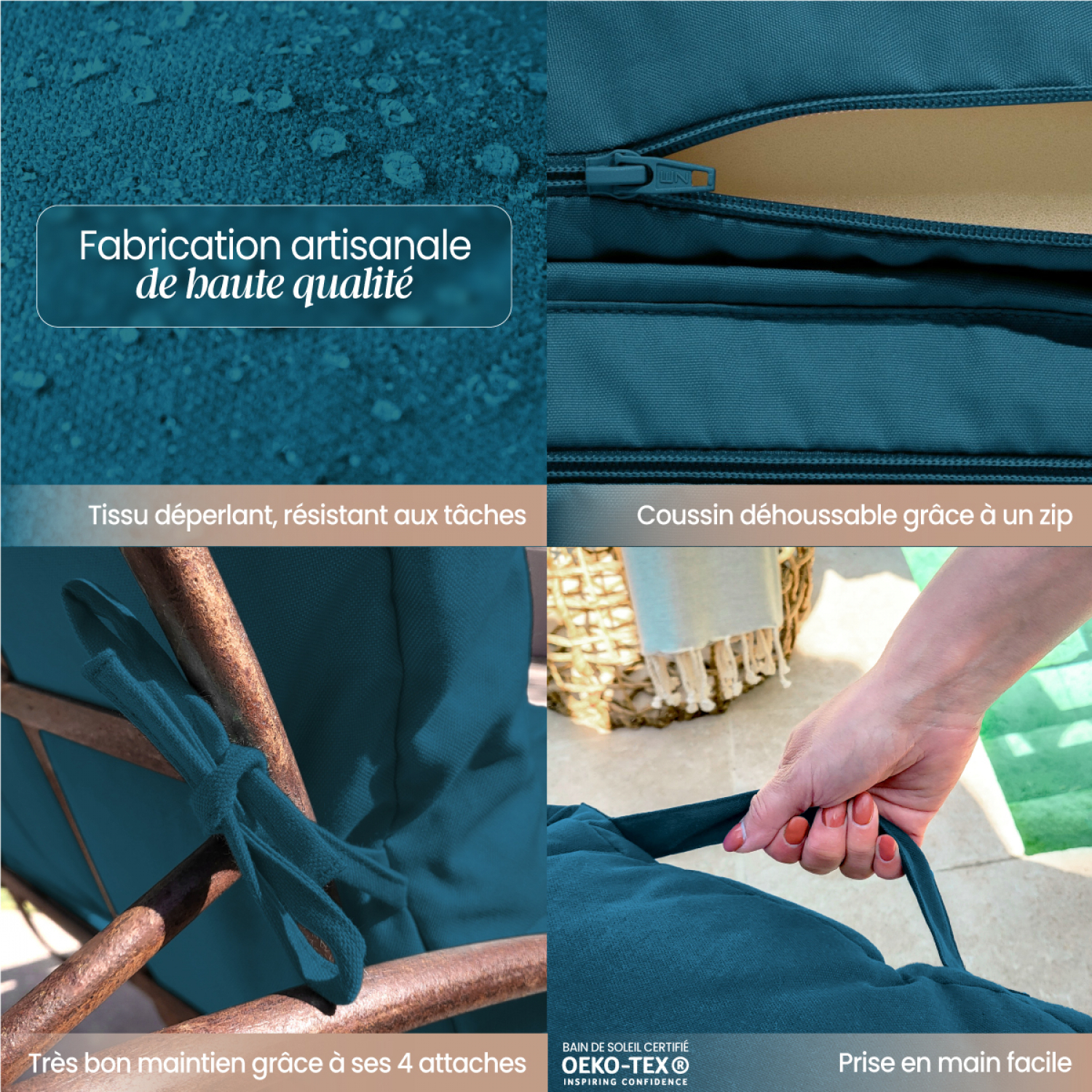 Fabriqué à la main en tissu Oxford 180 gsm, ce coussin pour transat déhoussable Linxor est ultra confortable. Garni d'une belle épaisseur de mousse densité 24/Kg m3, il invite à une sieste réconfortante au soleil. Certifié OEKO-TEX® STANDARD 100, ce coussin pour bain de soleil est garanti sans substances indésirables pour la santé et pour la peau. Imperméable, le tissu est dense, il est fait pour résister dans le temps. Le coussin est déhoussable à l'aide d'une fermeture zippée. Ainsi, vous pouvez laver la housse en machine à 30° et conserver votre coussin toujours propre afin de passer un agréable moment sur votre transat. De plus, grâce à un traitement déperlant, ce coussin de bain de soleil fait ruisseler les gouttes d'eau sans les absorber. Particulièrement respirant, ce produit résiste aussi aux tâches et à la chaleur pour une quête de repos ultime. Ce coussin de bain de soleil pour transat mesure environ 183 cm de longueur par 60 cm de largeur et 5 cm d'épaisseur. De chaque côté du bain soleil se trouvent des ficelles de maintien pour fixer le coussin au transat. Ce produit fait partie de la gamme La Voguette. Autres coloris disponibles. Les transats ne sont pas fournis avec le coussin.