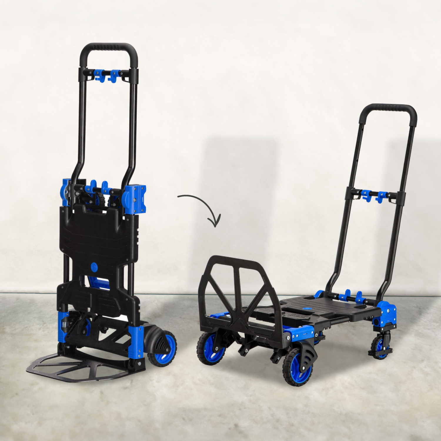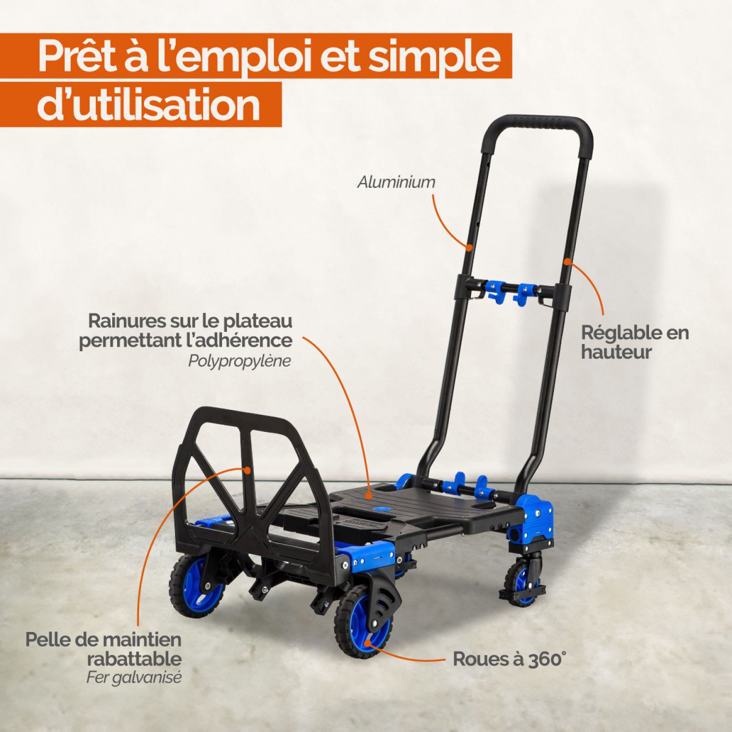Ce diable chariot 2 en 1 Linxor a la particularité de se positionner soit en chariot pouvant transporter jusqu’à 137 kg ou en diable pouvant supporter jusqu’à 70 kilos. Le passage d’une position à l’autre est très simple et ultra rapide. Réalisé en aluminium, en fer galvanisé et en résine de polypropylène, ce chariot est très robuste et durable dans le temps, il résiste à l’eau, aux variations de températures et aux chocs. Idéal pour un déménagement. Ultra intuitif, et déjà prêt à l’emploi, ce diable chariot 2 en 1 s’ajuste en hauteur grâce à une poignée agrippante, et dispose d’une pelle rabattable rainurée permettant le maintien du chargement en mode chariot. Il s’adapte à tous vos besoins logistiques. En chariot, il mesure de 66 à 91 cm de hauteur par 65 cm de longueur (avec les roues) et 46 cm de largeur (avec les roues). La largeur de la plateforme est de 37.5 cm. En diable, il mesure de 110 à 134 cm de hauteur par 46 cm de largeur (avec les roues). La profondeur de la bavette (pelle rabattable) est de 25.5 cm et sa largeur de 35.5 cm. Plié, ce diable chariot 2 en 1 mesure 12 cm de hauteur par 65 cm de longueur. Les petites roues mesurent 9 cm de diamètre et les grandes roues 12.7 cm. Coloris : noir (bleu pour les parties amovibles).