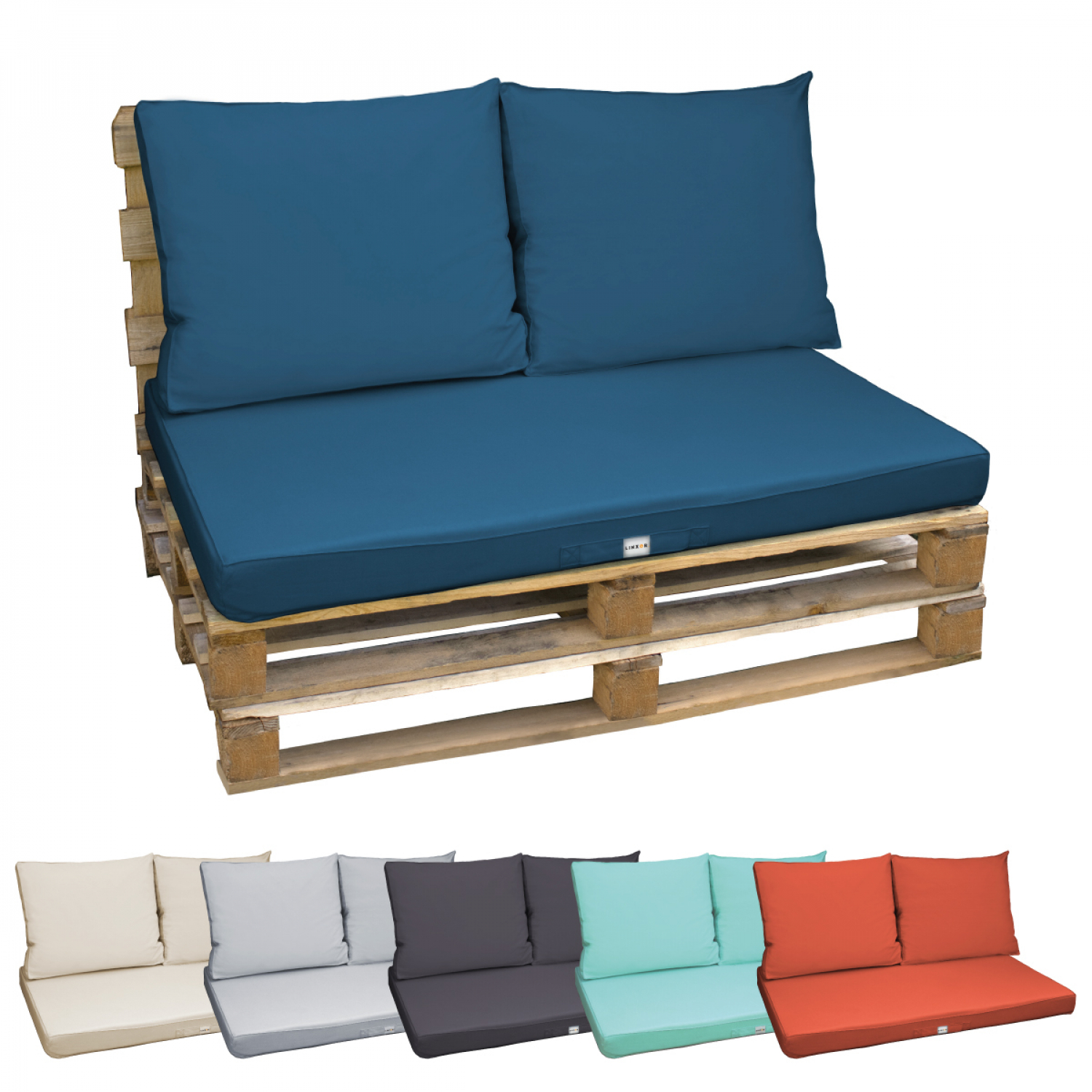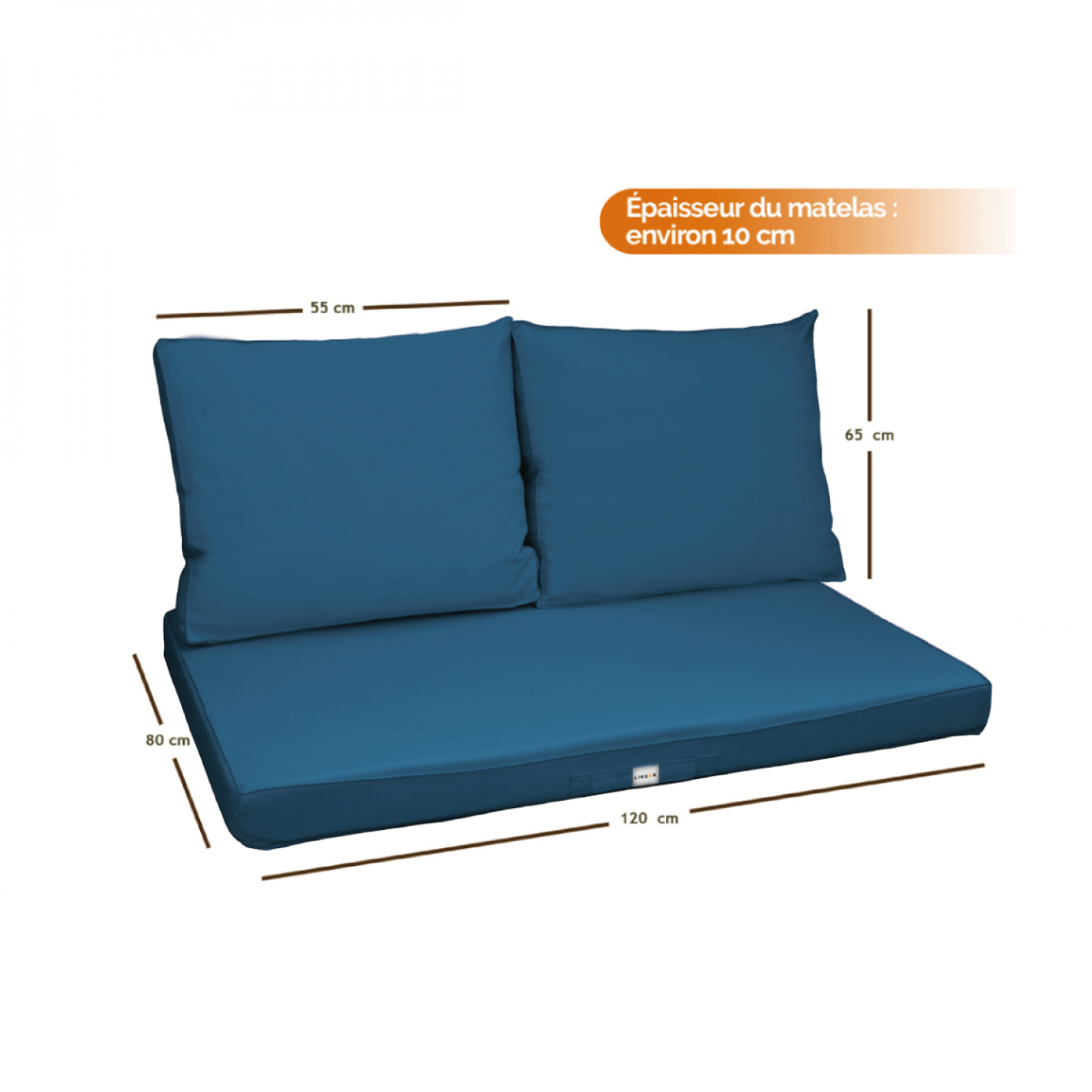 Le kit de coussins pour palette Linxor habillera parfaitement votre terrasse ou votre jardin. Composé d'une belle assise et de deux coussins garnis de mousse et recouvert d'un tissu oxford en 100% polyester, ce kit de coussins pour palette fabriqué entièrement à la main est ultra confortable. Certifié OEKO-TEX® STANDARD 100, le kit de coussins pour palette est garanti sans substances indésirables pour la santé et pour la peau. Avec 180 gr/m², le tissu est dense. Il est fait pour résister dans le temps. Coussins comme assise sont déhoussables à l'aide d'une fermeture zippée invisible. Ainsi vous pouvez laver les housses en machine à 30° et conserver un salon de jardin toujours propre afin de passer un agréable moment en famille ou entre amis. L'assise mesure environ 120 cm de largeur par 80 cm de profondeur et 10 cm d'épaisseur. Les deux coussins mesurent environ 55 cm de largeur par 65 cm de hauteur et 10 cm d'épaisseur. Ce produit fait partie de la gamme La Voguette. Autres coloris disponibles. Les palettes ne sont pas fournies avec le kit de coussins pour palette.