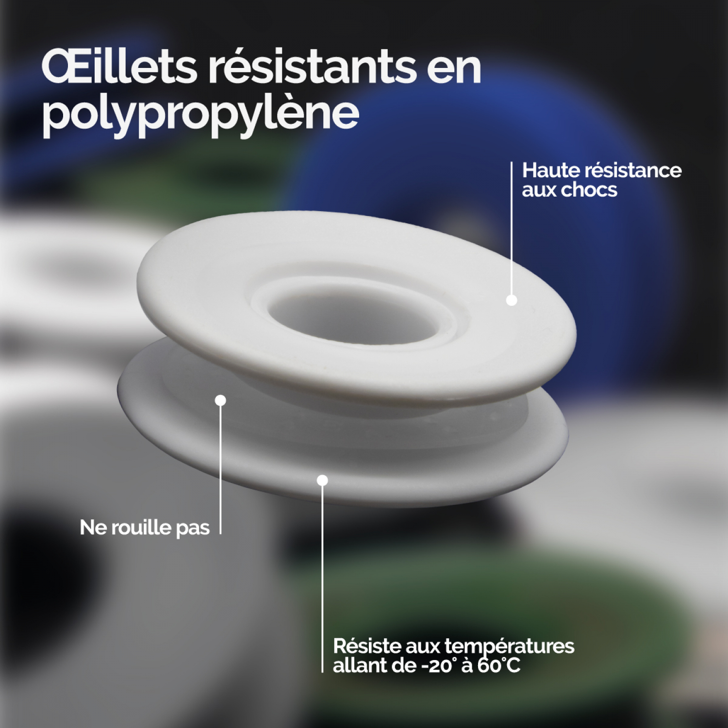 Les oeillets à clipser Linxor sont à utiliser pour renforcer les trous des bâches de protection, les trous de bâches à bulles, mais également pour soutenir d'autres matériaux comme les textiles, les auvents ou encore les banderoles. Les oeillets à clipser pour bâche sont réalisés en polypropylène, un matériau connu pour sa haute résistance aux chocs, aux produits chimiques et aux intempéries. Les oeillets supportent des températures allant de -20° à + 60°C. Chaque oeillet se compose de 3 parties : une partie femelle, une rondelle et une partie mâle. La bâche est à positionner juste avant la partie mâle de l'oeillet, il suffit ensuite de clipser simplement l'ensemble des parties de l'oeillet avec vos mains, aucun outil n'est nécessaire. Chaque oeillet à un orifice de 12 mm et un diamètre total de 30 mm. Approprié aux matériaux allant jusqu'à une épaisseur de 1.4 millimètre. Plusieurs coloris disponibles.