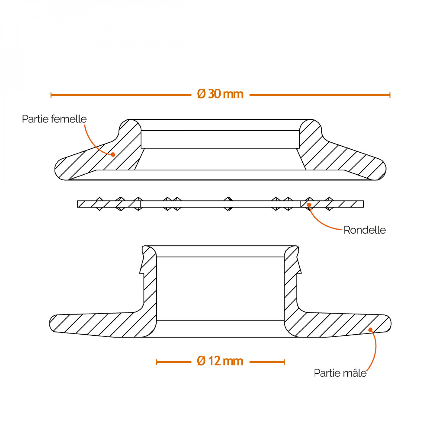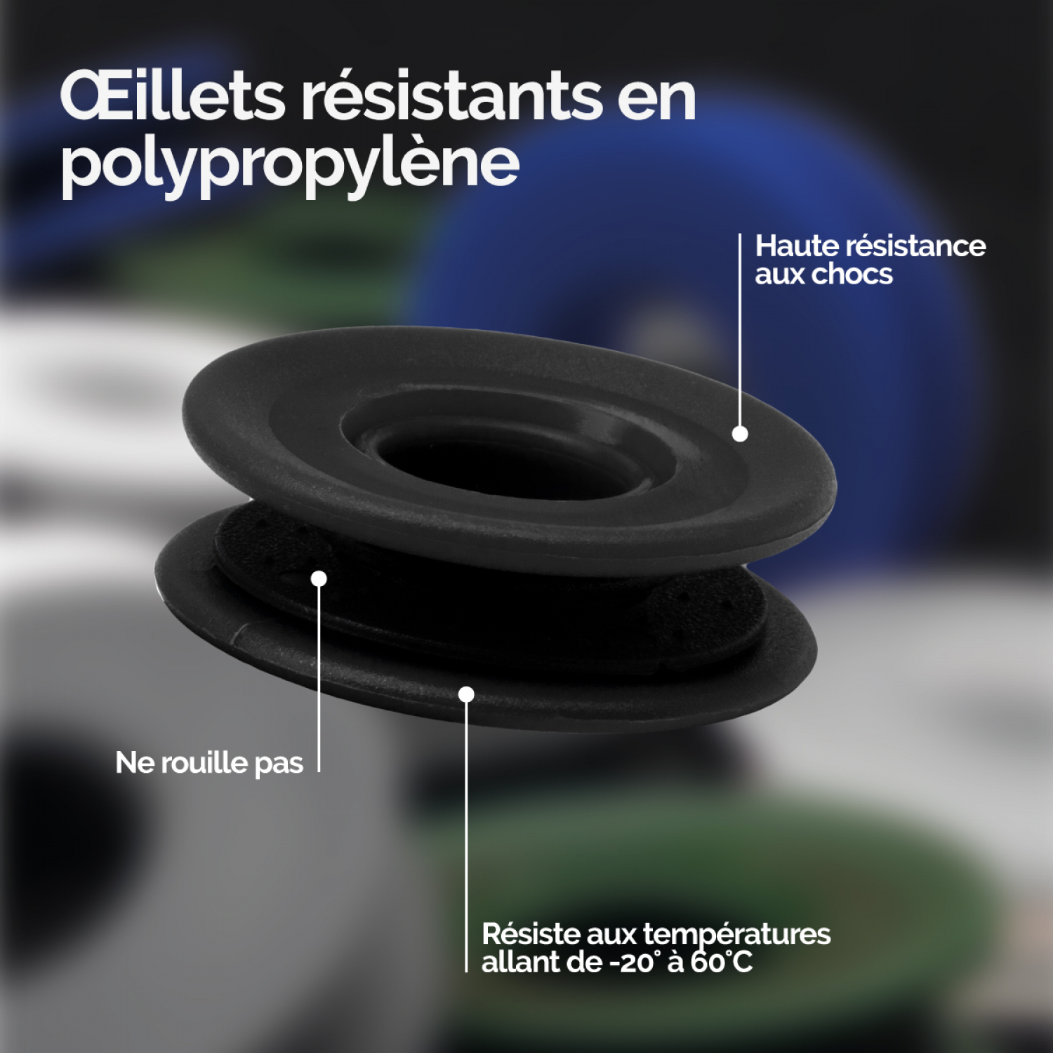 Les oeillets à clipser Linxor sont à utiliser pour renforcer les trous des bâches de protection, les trous de bâches à bulles, mais également pour soutenir d'autres matériaux comme les textiles, les auvents ou encore les banderoles. Les oeillets à clipser pour bâche sont réalisés en polypropylène, un matériau connu pour sa haute résistance aux chocs, aux produits chimiques et aux intempéries. Les oeillets supportent des températures allant de -20° à + 60°C. Chaque oeillet se compose de 3 parties : une partie femelle, une rondelle et une partie mâle. La bâche est à positionner juste avant la partie mâle de l'oeillet, il suffit ensuite de clipser simplement l'ensemble des parties de l'oeillet avec vos mains, aucun outil n'est nécessaire. Chaque oeillet à un orifice de 12 mm et un diamètre total de 30 mm. Approprié aux matériaux allant jusqu'à une épaisseur de 1.4 millimètre. Plusieurs coloris disponibles.