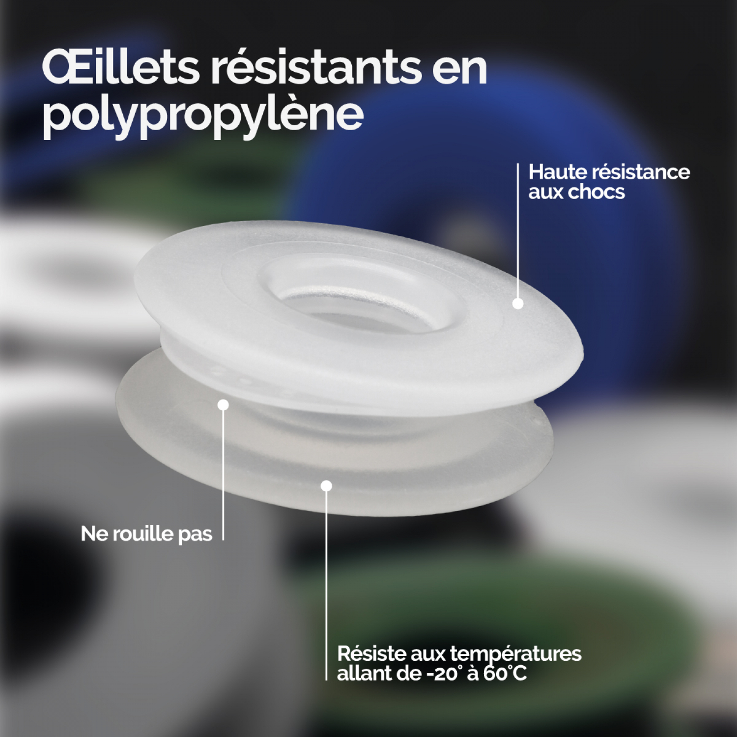 Les oeillets à clipser Linxor sont à utiliser pour renforcer les trous des bâches de protection, les trous de bâches à bulles, mais également pour soutenir d'autres matériaux comme les textiles, les auvents ou encore les banderoles. Les oeillets à clipser pour bâche sont réalisés en polypropylène, un matériau connu pour sa haute résistance aux chocs, aux produits chimiques et aux intempéries. Les oeillets supportent des températures allant de -20° à + 60°C. Chaque oeillet se compose de 3 parties : une partie femelle, une rondelle et une partie mâle. La bâche est à positionner juste avant la partie mâle de l'oeillet, il suffit ensuite de clipser simplement l'ensemble des parties de l'oeillet avec vos mains, aucun outil n'est nécessaire. Chaque oeillet à un orifice de 12 mm et un diamètre total de 30 mm. Approprié aux matériaux allant jusqu'à une épaisseur de 1.4 millimètre. Plusieurs coloris disponibles.