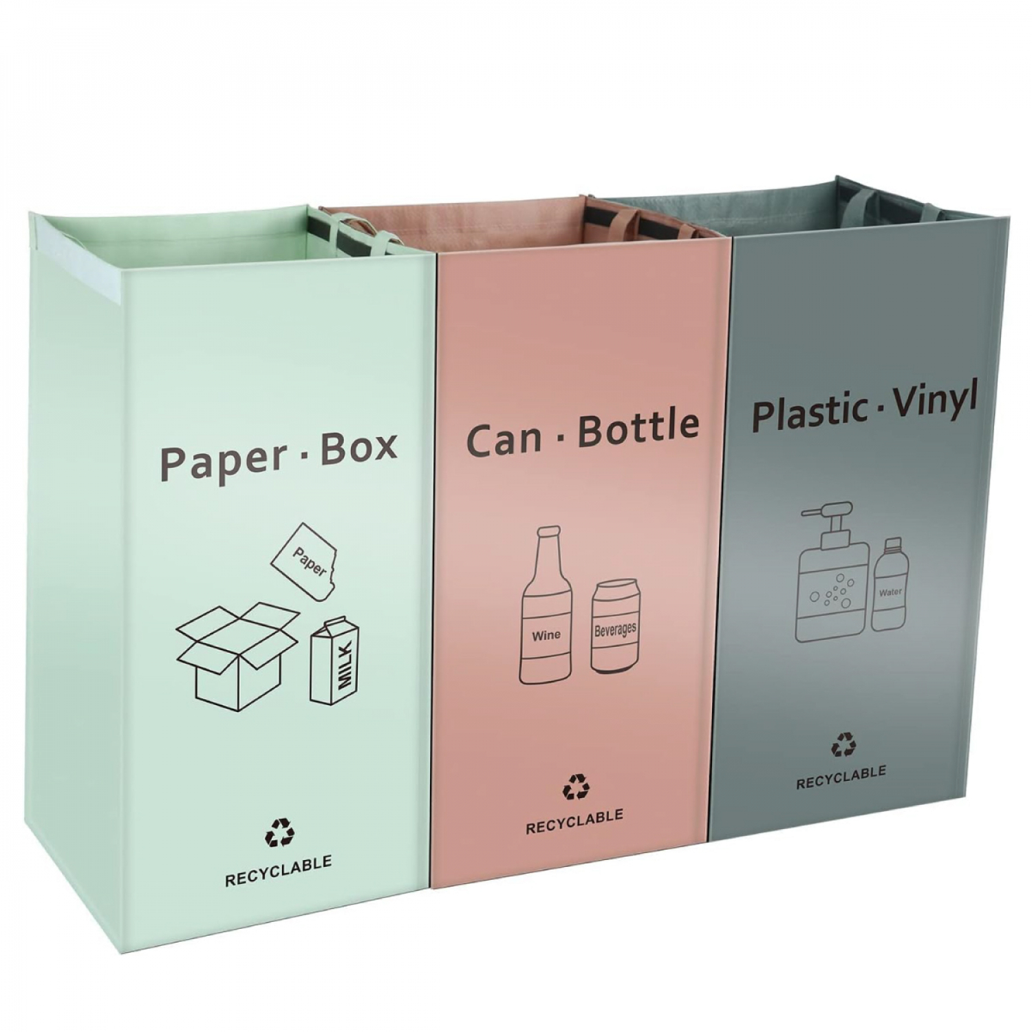 Ce lot de 3 sacs de recyclage Linxor est idéal pour vous aider à faire le tri de vos déchets et vous faciliter le recyclage des emballages en plastique (vert foncé), en verre (vieux rose) et en papier/carton (vert clair). Réalisé en polypropylène, chaque sac est solide et durable. Très pratiques, les poignées sont résistantes au poids du sac. Ces sacs de recyclage sont donc conçus pour durer. Grâce à un scratch positionné sur chaque sac, les sacs s’attachent les uns avec les autres, pour un rangement optimal. Lorsque vous souhaitez vider un sac, rien de plus simple que de le décrocher et le transporter à l’aide des poignées. Chacun de ces 3 sacs de recyclage mesure 60 cm de hauteur, 30 cm de largeur et 30 cm de profondeur. La contenance des 3 sacs réunis est de 160 L. Pour nettoyer les sacs, passer un simple coup d’éponge. Notre ambition est de répondre à vos besoins du quotidien en vous proposant des gammes de plus en plus variées, durables et tendances. Un large éventail de produits est à retrouver à travers nos différentes marques.