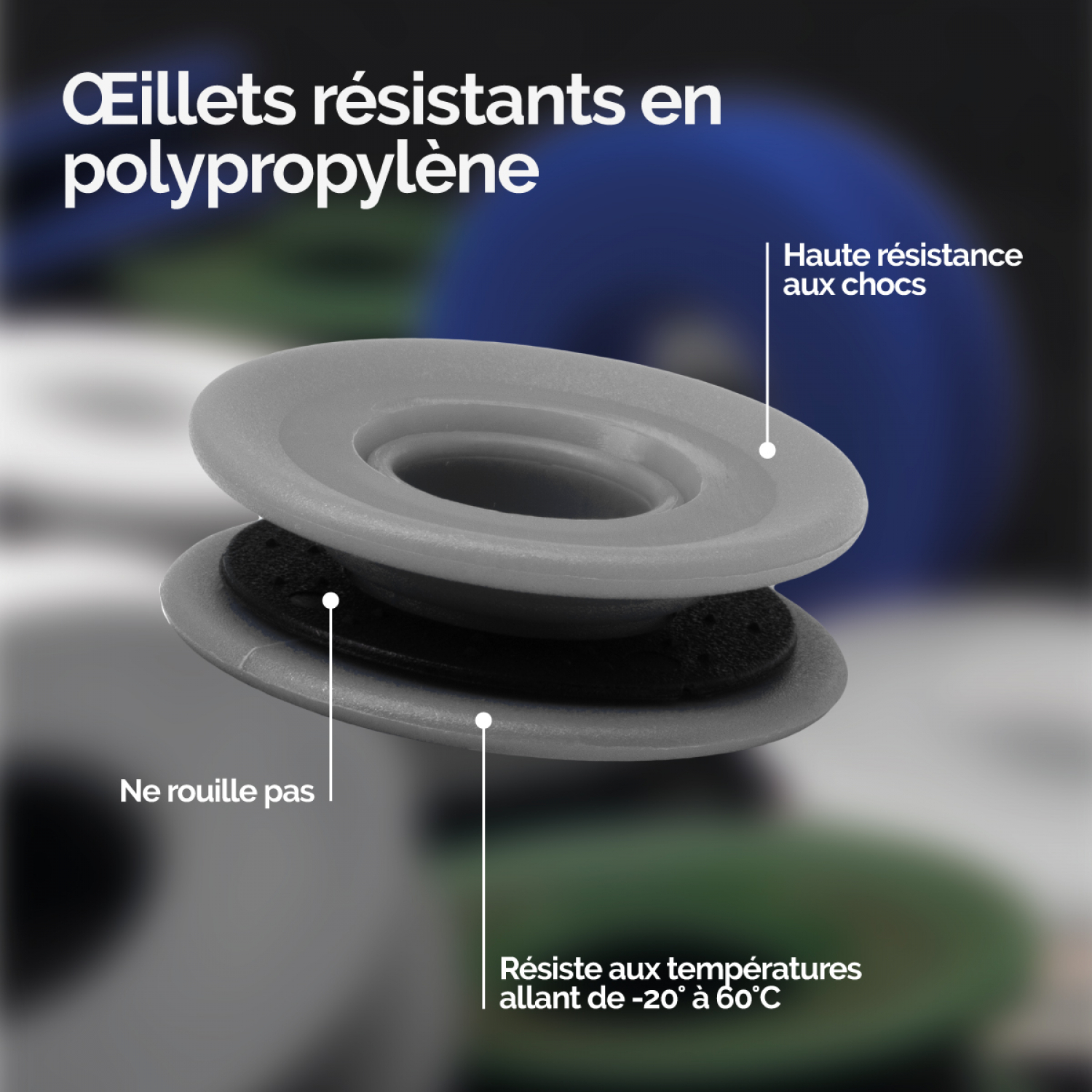 Les oeillets à clipser Linxor sont à utiliser pour renforcer les trous des bâches de protection, les trous de bâches à bulles, mais également pour soutenir d'autres matériaux comme les textiles, les auvents ou encore les banderoles. Les oeillets à clipser pour bâche sont réalisés en polypropylène, un matériau connu pour sa haute résistance aux chocs, aux produits chimiques et aux intempéries. Les oeillets supportent des températures allant de -20° à + 60°C. Chaque oeillet se compose de 3 parties : une partie femelle, une rondelle et une partie mâle. La bâche est à positionner juste avant la partie mâle de l'oeillet, il suffit ensuite de clipser simplement l'ensemble des parties de l'oeillet avec vos mains, aucun outil n'est nécessaire. Chaque oeillet à un orifice de 12 mm et un diamètre total de 30 mm. Approprié aux matériaux allant jusqu'à une épaisseur de 1.4 millimètre. Plusieurs coloris disponibles.