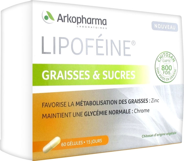 Arkopharma Lipoféine Graisses et Sucres 60 Gélules est un complément alimentaire sous forme de gélule, à base de Chitosan, de Zinc et de Chrome. Ce complément alimentaire contient une nouvelle formule double action qui permet d'agir à la fois sur les graisses et les sucres. Le Zinc, contribue au métabolisme des acides gras et au métabolisme glucidique. Le Chrome contribue au maintien d'une glycémie normale. Cette formule est complétée par du Chitosan, d'origine végétale, connu pour absorber jusqu'à 800 fois son poids en graisse. Il se lie aux graisses de l'alimentation pour être ensuite éliminé, sans être digéré par les voies naturelles.