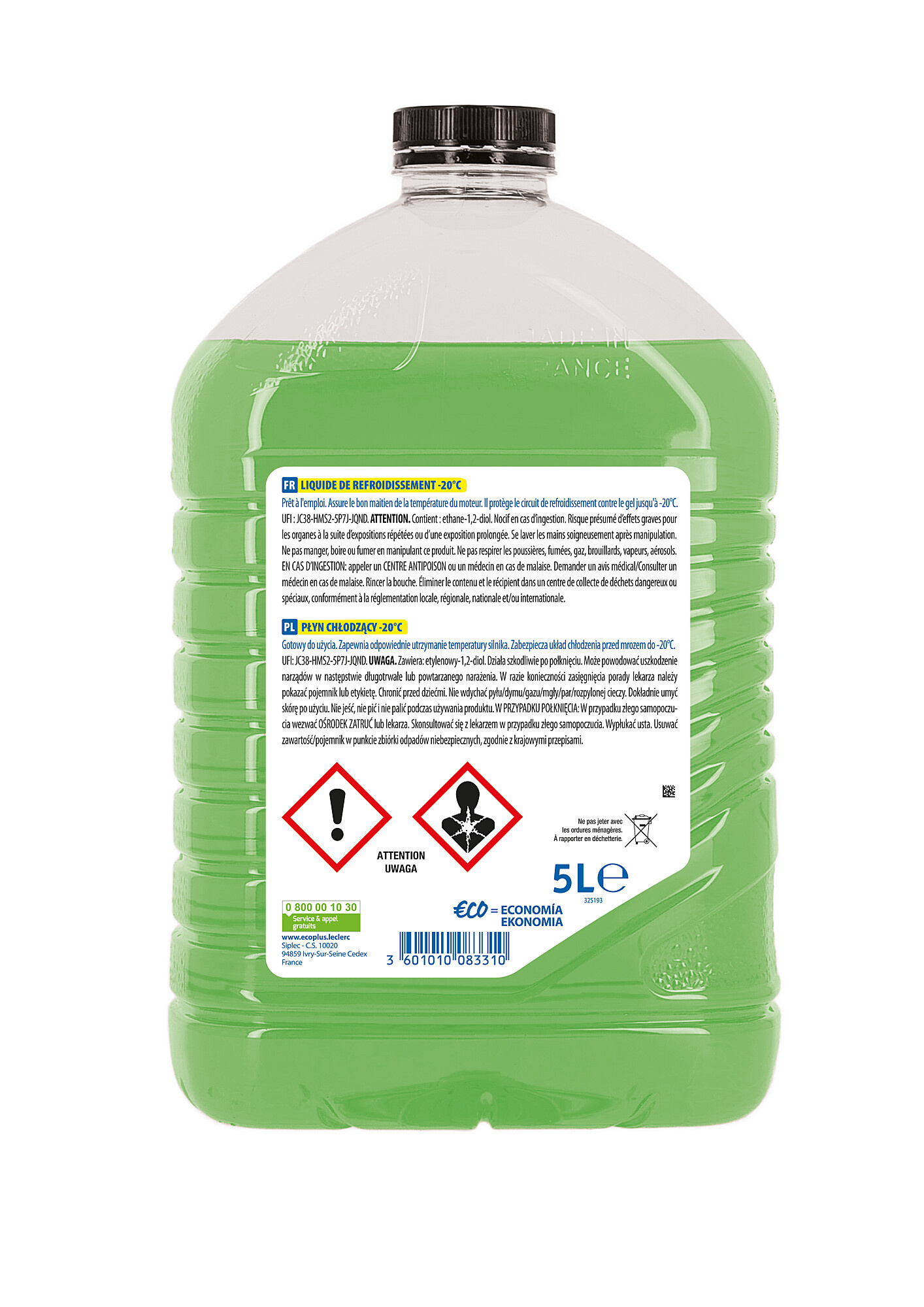 Prêt à l'emploi. II protège le circuit de refroidissement contre le gel jusqu'à -20°C et assure le bon maitien de la température du moteur. Nocif en cas d'ingestion. Risque présumé d'effets graves pour les organes à la suite d'expositions répéttées ou d'une exposition prolongée. Se laver les mains soigneusement après manipulation. Ne pas manger, boire ou fumer en manipulant ce produit. Ne pas respirer les poussières, fumées, gaz, brouillards, vapeurs, aérosols. EN CAS D'INGESTION: appeler un CENTRE ANTIPOISON ou un médecin en cas de malaise. Demander un avis médical/Consulter un médecin en cas de malaise. Rincer la bouche. Éliminer le contenu et le récipient dans un centre de collecte de déchets dangereux ou spéciaux, conformément à la réglementation locale, régionale, nationale et/ou internationale. ATTENTION. Contient : ethane-1,2-diol. Ce produit est fabriqué en France.