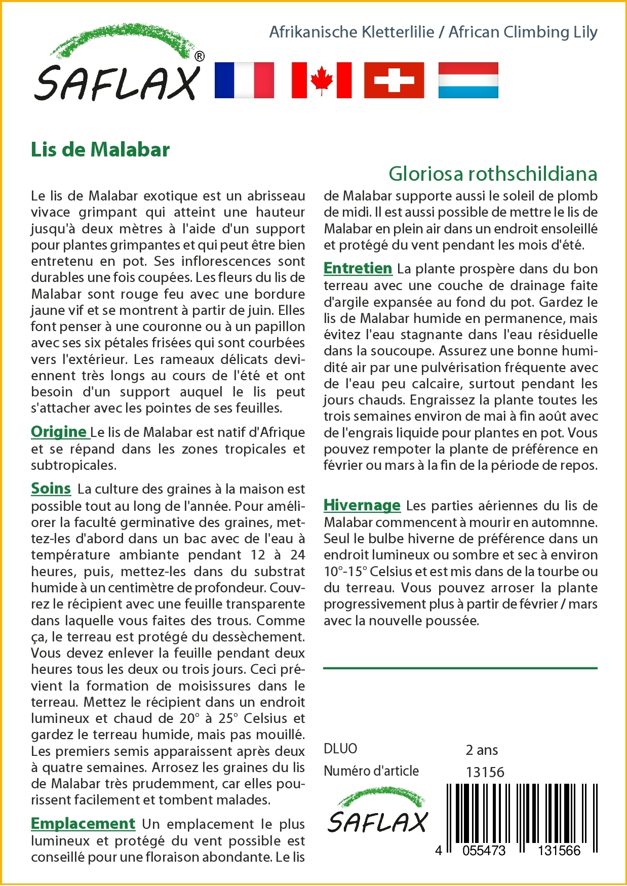 | Libellé | Lis de Malabar - 15 graines - Gloriosa rothschildiana |