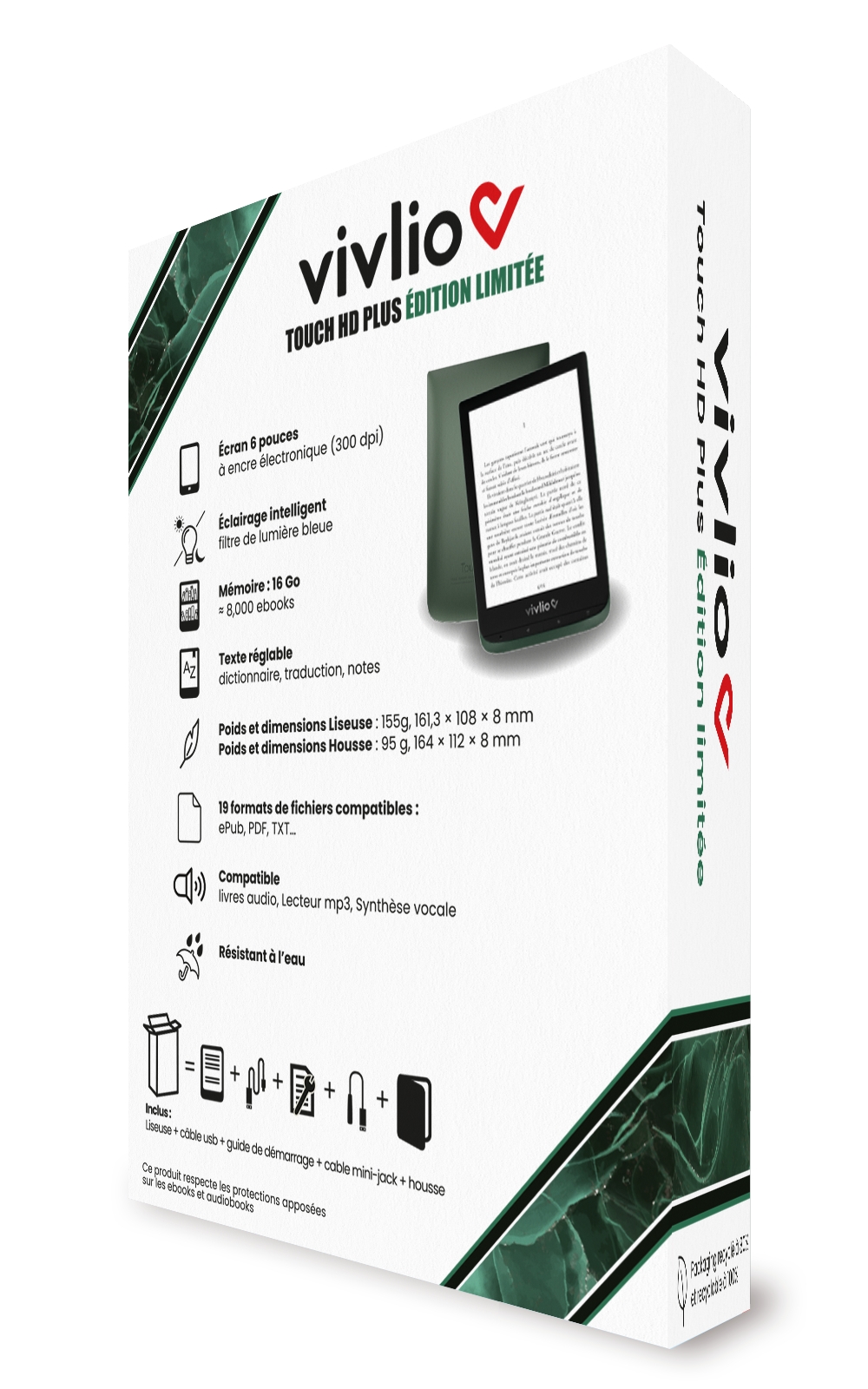 Liseuse Vivlio Touch HD Plus au coloris inédit + housse inédite + ebook \"Paradis perdus\" d'Eric-Emmanuel Schmitt. Allier un maximum de fonctionnalités (compatibilité livre audio, waterproof et légèreté) et de mobilité sans oublier le style, c'est possible avec la liseuse Touch HD Plus ! La boîte contient : - la liseuse garantie 2 ans - 1 housse inédite - 1 guide de démarrage - 1 câble de chargement USB - 1 adaptateur micro-USB / mini-jack - Le ebook \"Paradis perdus\" d'Eric-Emmanuel Schmitt - 1 pack d'ebooks offerts.