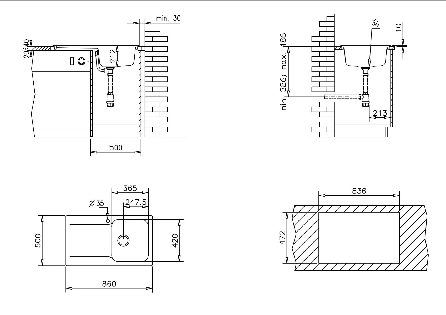 - Cuve à poser dans un caisson de 50cm de largeur minimum.