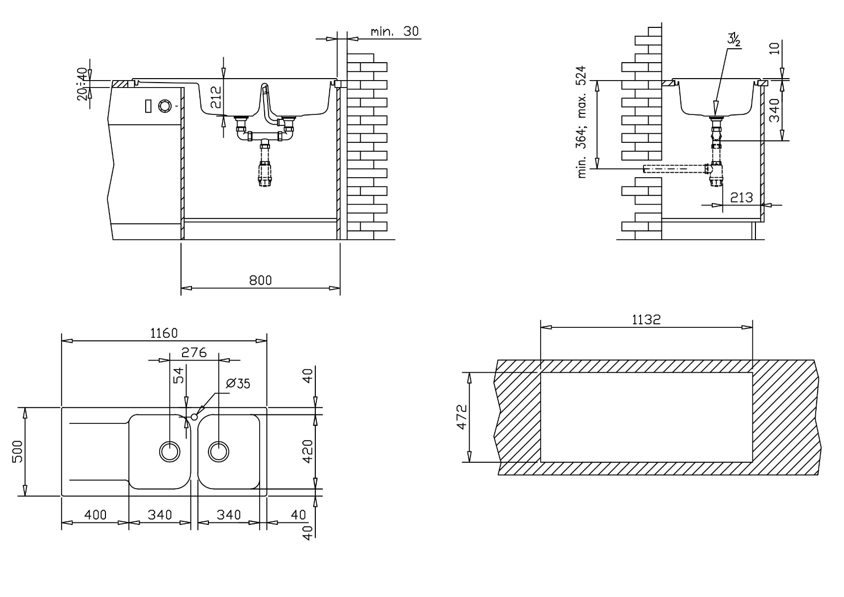 - Côtes d'encastrement (en cm) :113,2 L x 47,2 H
