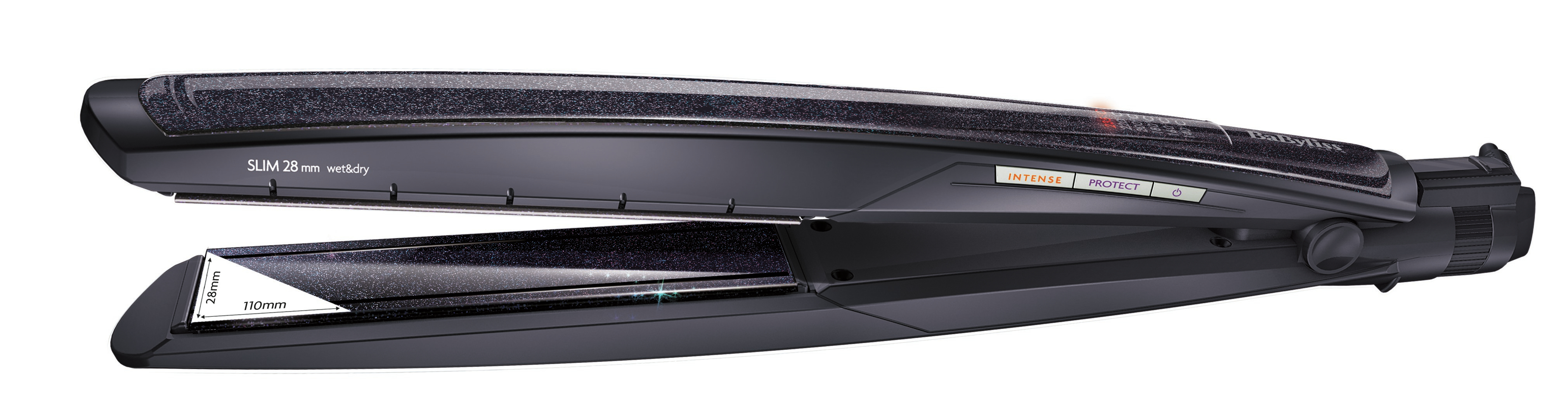Plaques étroites 28 x 110 mm Idéal pour cheveux mi-longs et longs Wet & Dry : sur cheveux secs ou humides Revêtement Crystal Ceramic - écran digital 6 températures Garantie 2 ans pièces et main d'œuvre