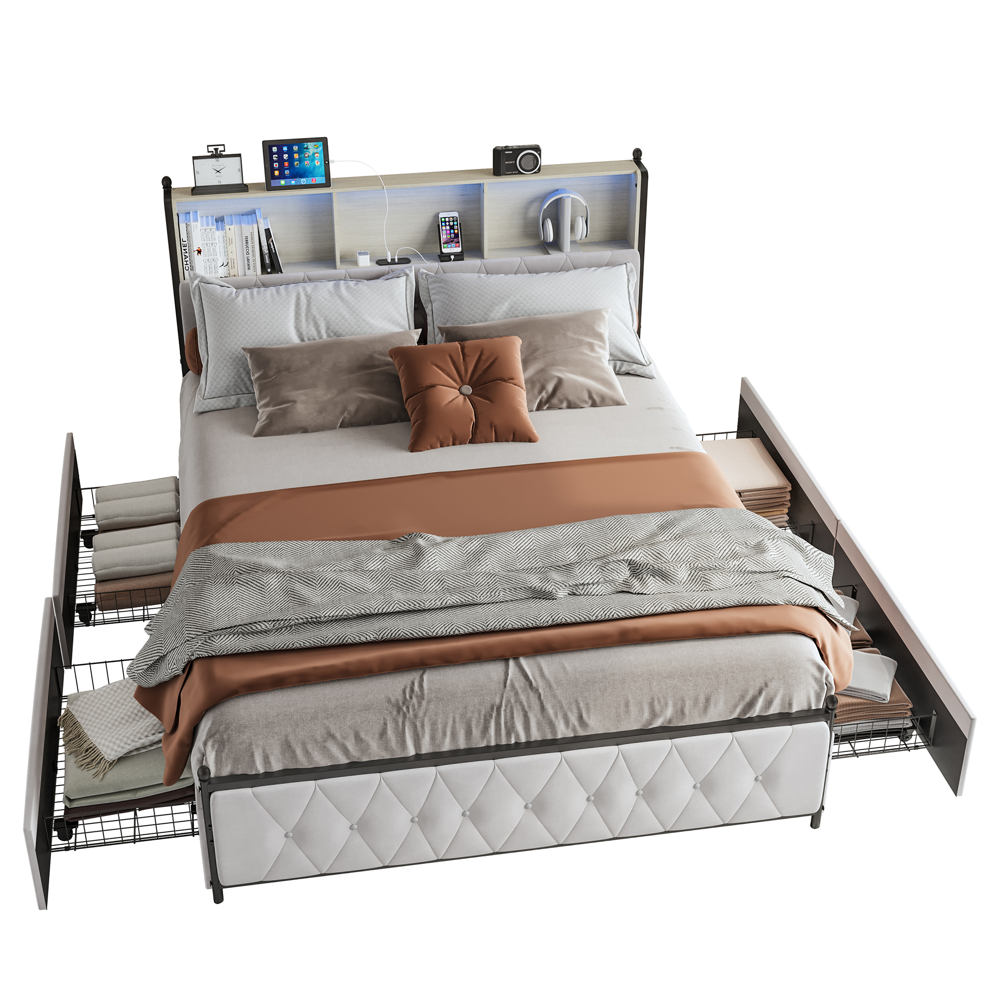 Lit 180 X 200 Cm Avec Base LED Et USB, 4 Tiroirs, Tête De Lit Avec Rangement, Velours, Beige