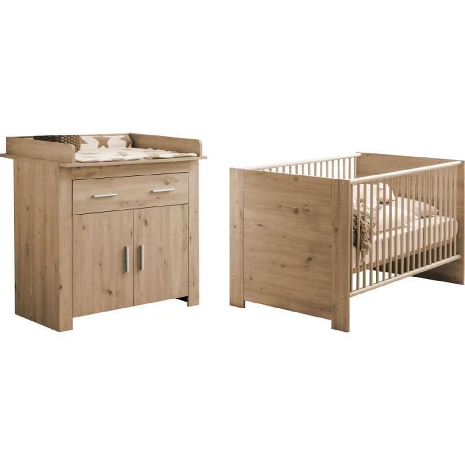 Chambre Bébé Ahoi 2 pièces, composée : - Un lit bébé pour couchage en 70 x 140 cm. Avec 3 barreaux amovibles et hauteur de sommier reglable sur 3 positions. Réalisé en panneau de particules mélaminés chene antique patinéet barreaux en bois massif laqué chene patiné. Dimensions (LxHxP) : 78 x 83 x 144 cm - Une commode avec plan a langer, 2 portes, 1 grand tiroir. Réalisée en panneau de particules mélaminés chene.